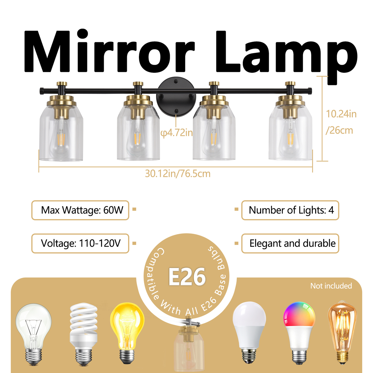 The lamp is equipped with 4 lamp heads, which can be installed with up to 60W E26 bulbs (sold separately), providing sufficient and even lighting, especially suitable for scenes such as makeup and shaving that require clear light. Its classic black and gold color scheme and smooth lines easily blend into modern, minimalist or industrial style bathroom spaces.