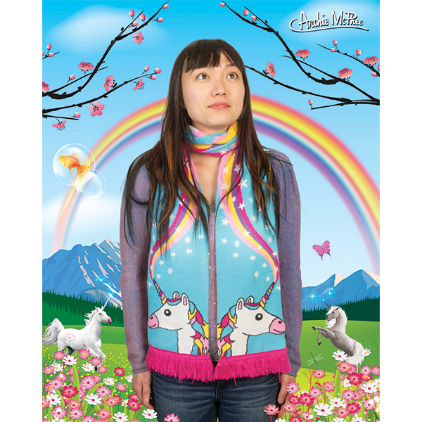 Even Fairyland has a winter! All the gnomes put on their tiny long underpants, the floating goldfish watch as their bubbles freeze and even the balrog feels a chill in his fiery heart. That's when all the creatures of Fairyland turn to the unicorn for winter clothing. A scarf is such a practical piece of clothing, can't it also be magical? This 71" long soft-knit acrylic Unicorn Scarf proclaims to the world, "It's cold out and I believe in unicorns!"