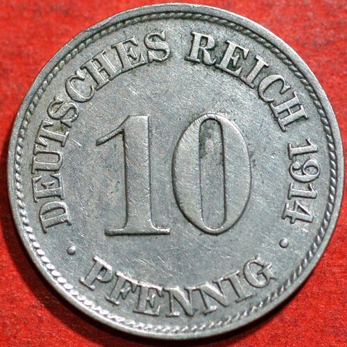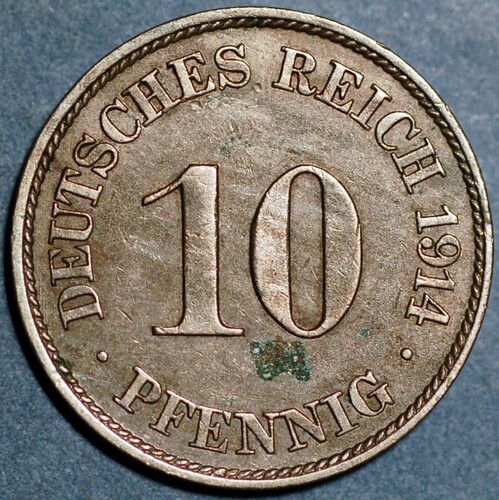 1914 J Germany 1 Pfennig (About Uncirculated, AU Condition) KM# 10