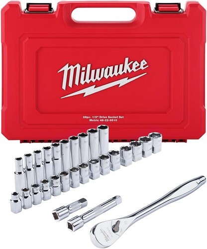 Our Milwaukee Metric 28 piece 1/4in. drive Ratchet Socket set is designed from the ground up, offering our users the most versatile sockets that are anti-roll and wrench-ready. Its innovative Four Flat sides feature an anti-roll and wrench-ready design. The 90 tooth ratchet tool offers 4 deg. of arc swing and a slim profile design, allowing you to work in tighter and more confined spaces, be it under the hood of a car or in the middle of a remodel. The ratchet and socket kit comes with a removable inner tray which is perfectly designed to be stored long-term in a steel storage chest. All of our sockets are stamped with metric measurements on the Flat Side. It also comes with a durable carrying case for ultimate portability. The set comes with accessories included so that our users can get every job done, both in the garage and on the jobsite.