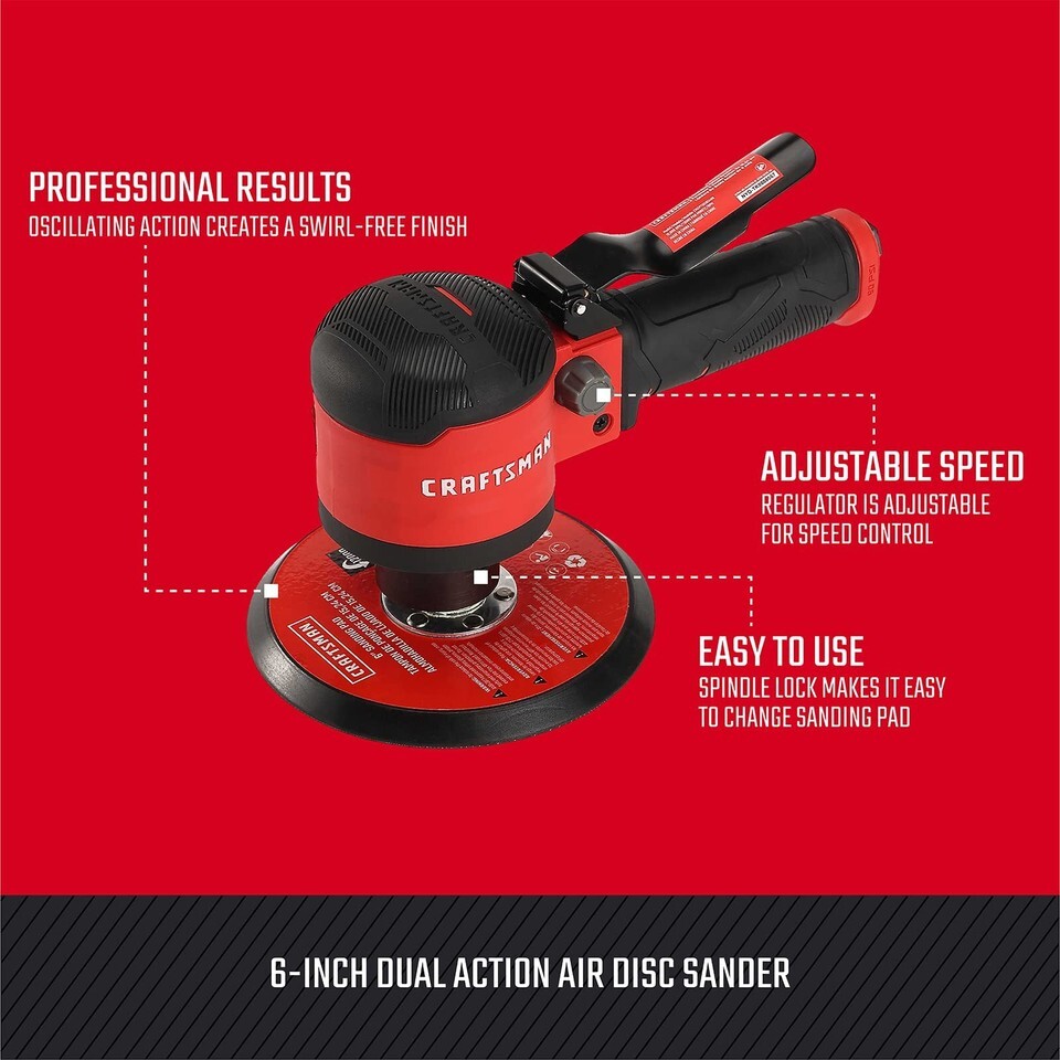 We're CRAFTSMAN, an authentic American icon. For nearly a century we have been the brand homeowners, home builders, auto enthusiasts and master mechanics trust. Today's CRAFTSMAN continues that legacy. Get a swirl-free finish with this dual oscillating Craftsman 6" Dual Action Air Sander. Built with ease in mind, change pads quickly and easily and without tools with the spindle lock feature. This sander is equipped with a built-in muffler to reduce noise, adjustable regulator to adjust speed and a vibration absorbing rubber handle.