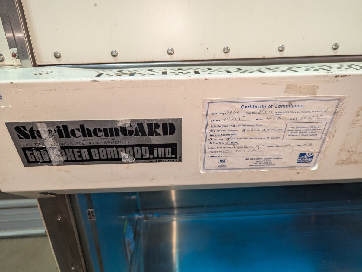 This Baker SG-400 SterilGard 4 FT Biological Safety Cabinet came from a large pharmaceutical company that had surplus equipment and was in use prior to removal. PLEASE NOTE: Unit has been tested and appears functional. The exterior of unit shows signs of use, age and storage. As a result, this listing is being sold as-is for "parts or not working condition". We urge customers to view all photos as they show overall condition, included accessories and useful information. Listing only includes what is shown in photos. We will be happy to provide additional information so please feel free to contact us with any questions.