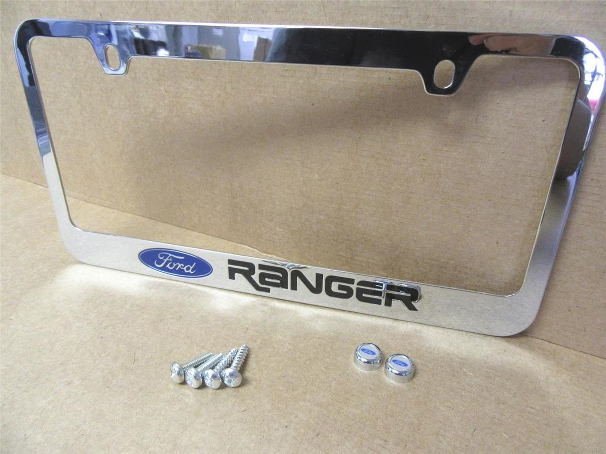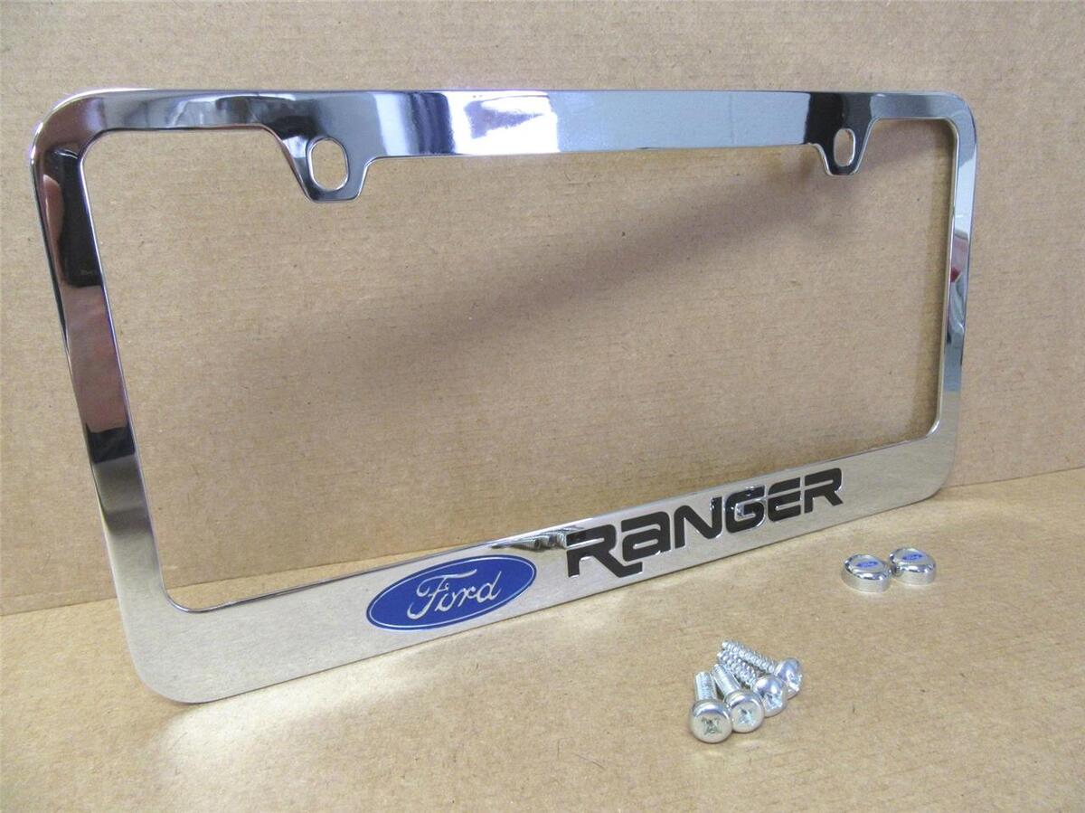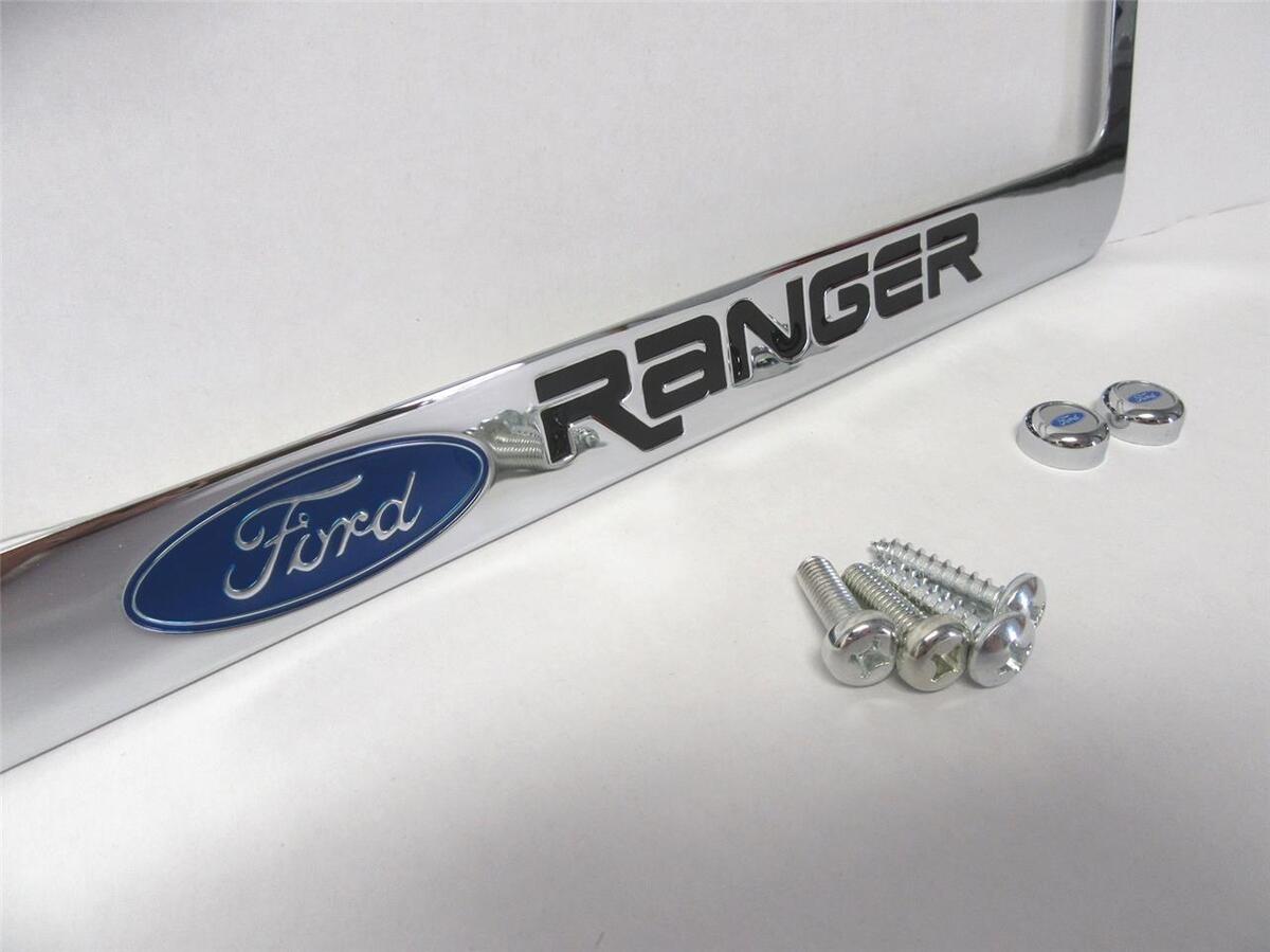 This listing is for one (1) chrome metal license plate frame with black lettering. Compatible with 1983-2021 Ford Ranger.