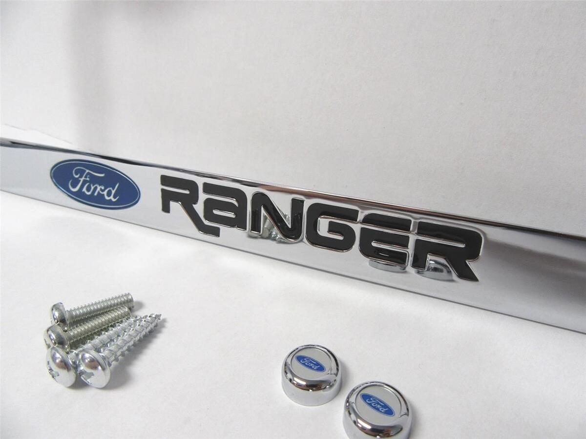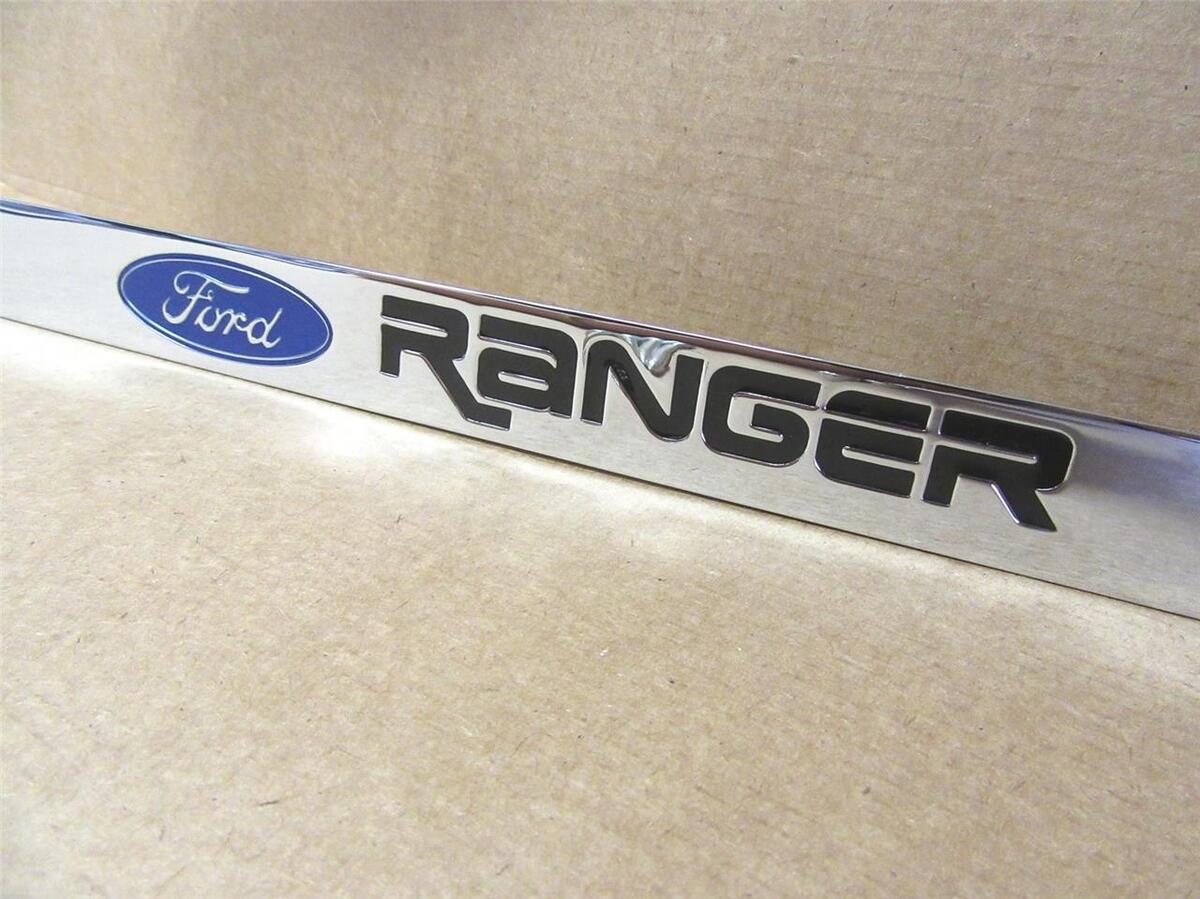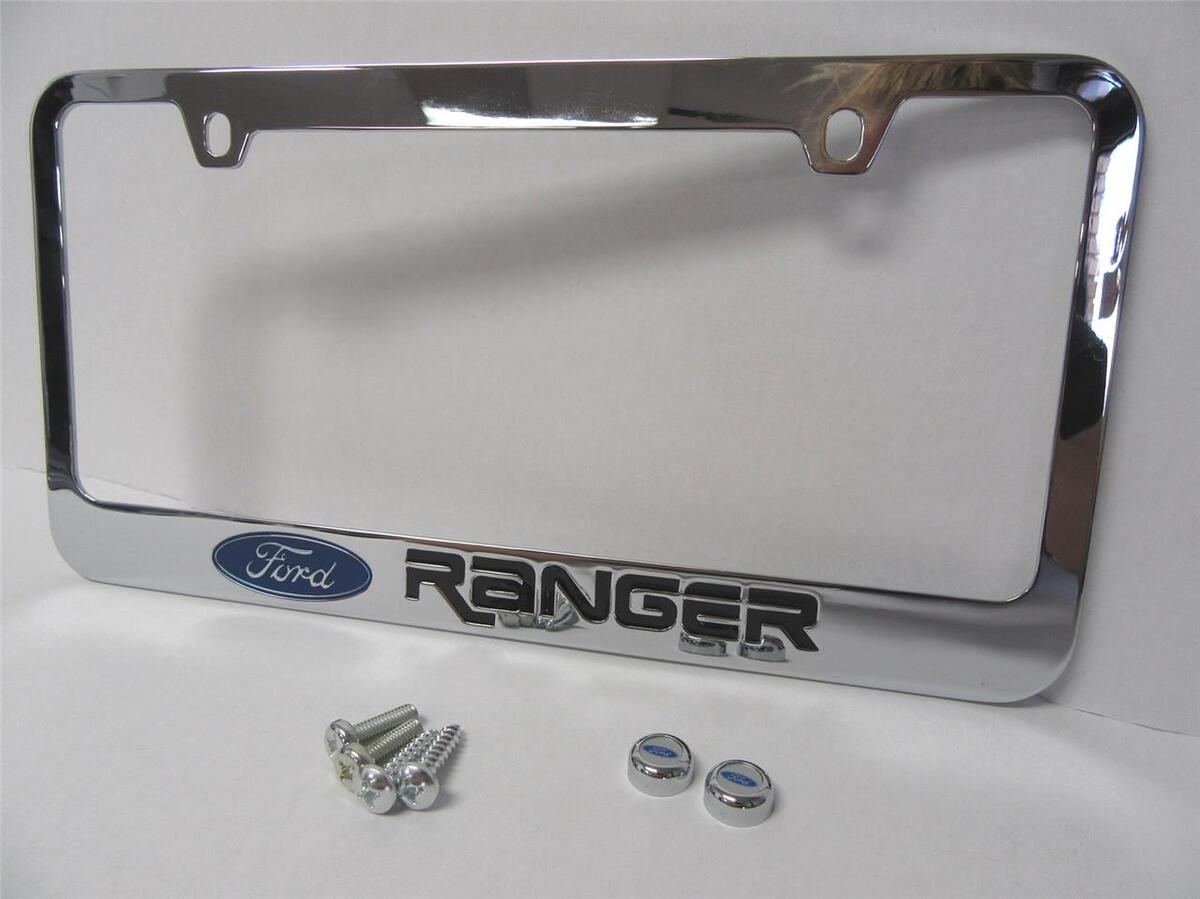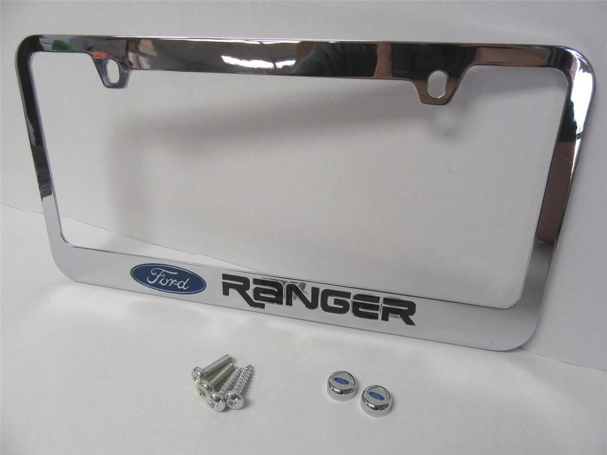 This listing is for one (1) chrome metal license plate frame with black lettering. Compatible with 1983-2021 Ford Ranger.