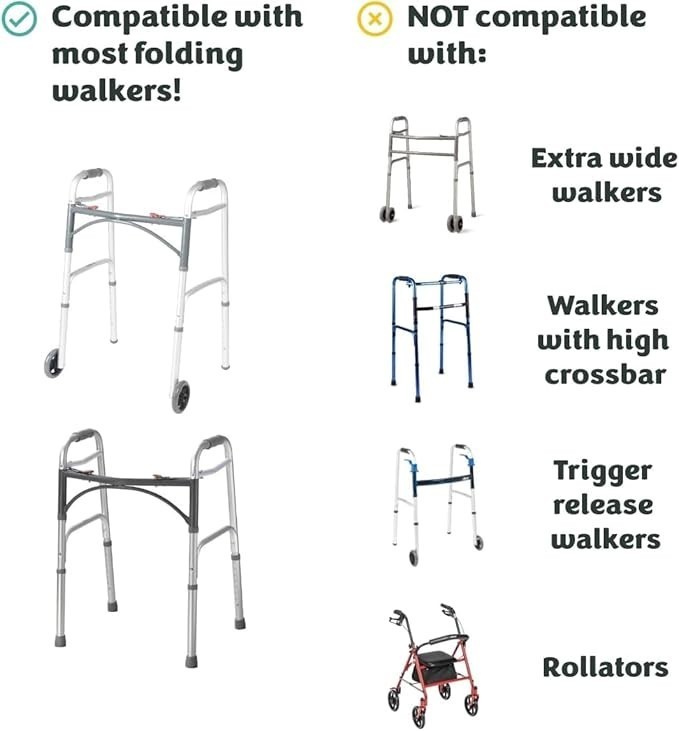 PLEASE MEASURE YOUR WALKER: Please see our measurements photo and make sure to measure your walker! This tray fits most newer standard walkers. It does NOT fit bariatric/extra wide/heavy duty walkers. Please note: If your walker hand grips measure more than 2 inches wide, the tray will NOT fit over them. The tray MUST sit flat on the walker. If the tray is uneven/tilted, it does NOT fit your walker and it is not safe to use.