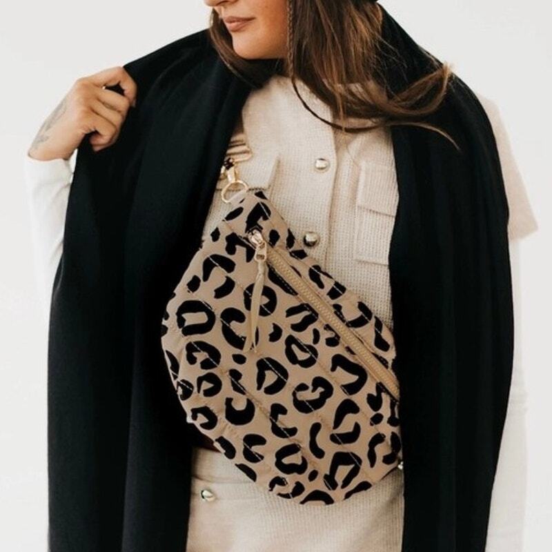 Black Tan Leopard Printed Quilted Puffer Sling Belt Crossbody Bag