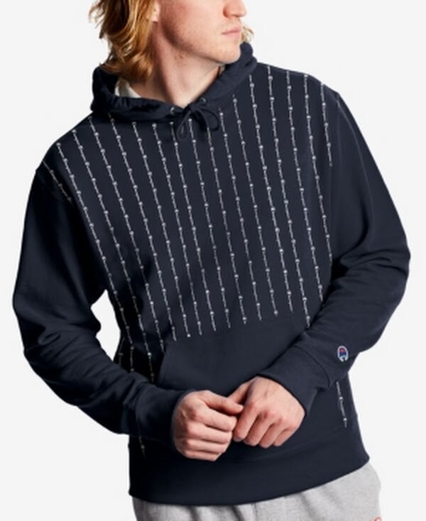 Champion Mens Powerblend Hoodie. Featuring extra stitch and metal detail for added durability, this pinstriped Champion hoodie will be with your for the long haul. Classic fit Drawstring hood Metal detail Kangaroo pocket Cotton/polyester Machine washable Imported