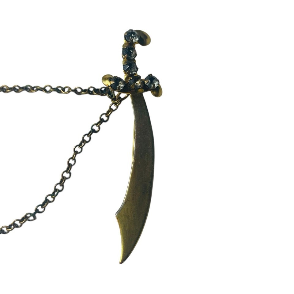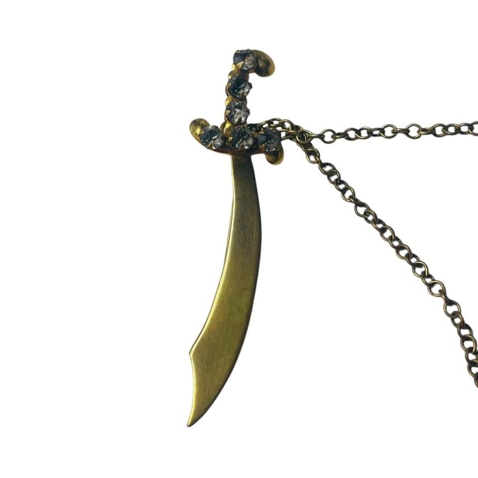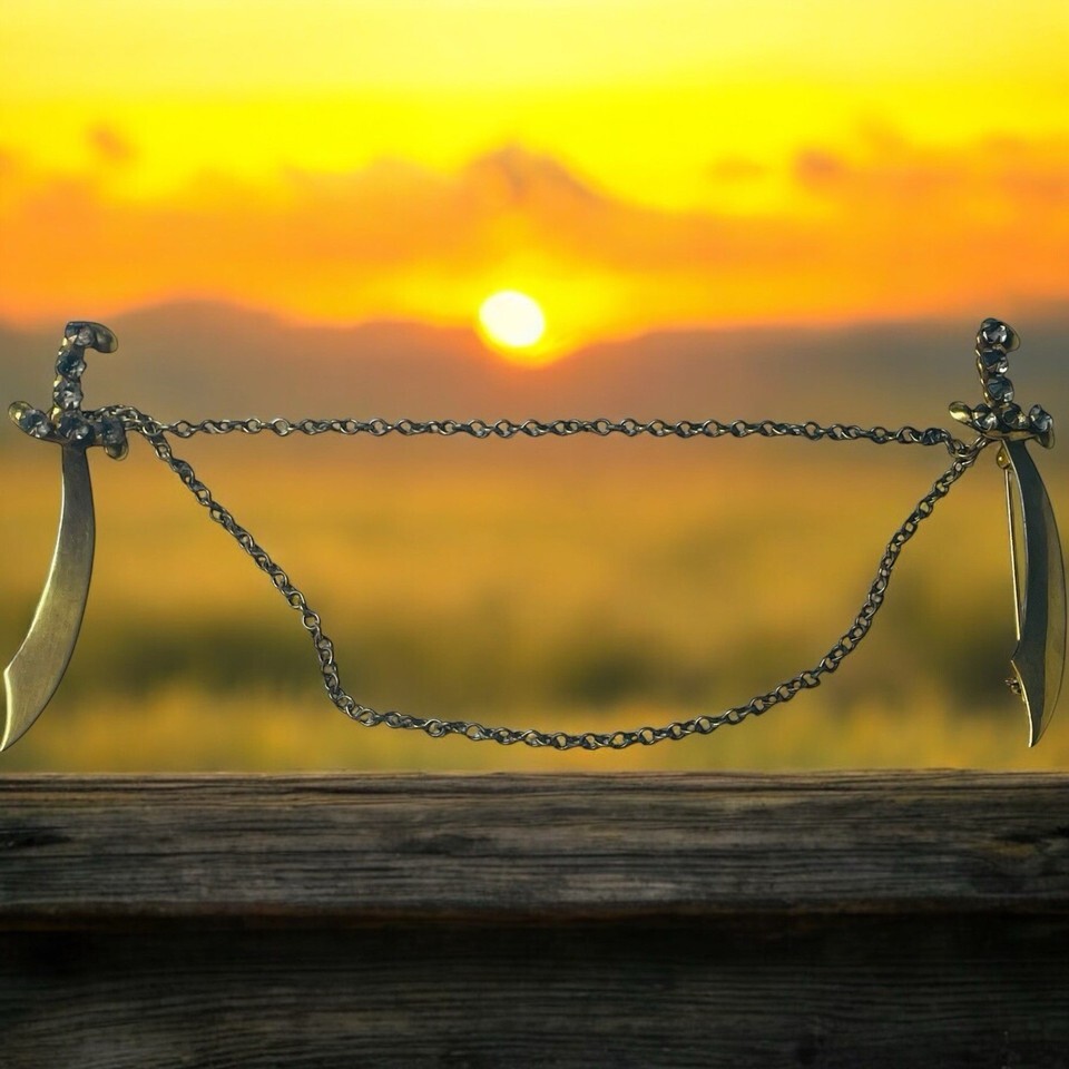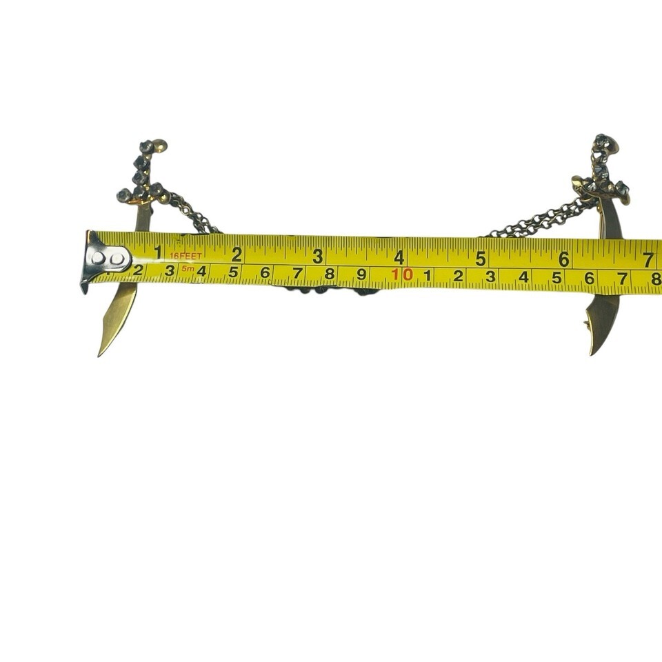 This vintage double brooch clip is a unique piece featuring a scimitar Arabian sword design. The metal material is most likely brass, the piece is not signed and contains blue rhinestones. Each sword is a brooch, with two chains in the middle connecting them. Can be worn on a lapel or pocket on one side, or as a sweater or vest clip as a closure.