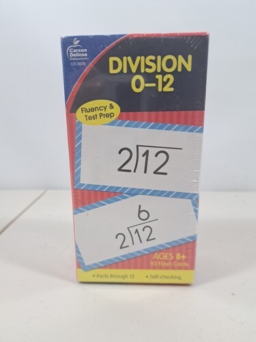 Enhance your child's mathematical abilities with these NWT Flash Cards from Carson Education. The set includes 93 cards covering division from 0-12, suitable for children aged 8 and above. Each card features clear, easy-to-read numbers and equations, making it the perfect tool for sharpening young minds.