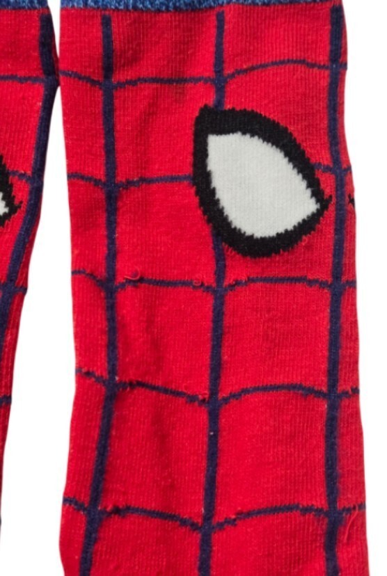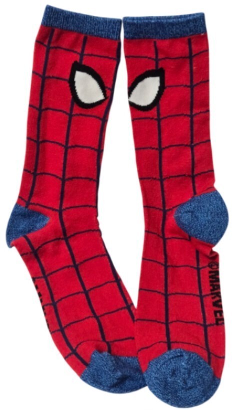 Design: Both items feature a red, black, and gray color scheme with Spider-Man character and costume details, including a black spider emblem on the hat cuff and white eye cutouts on the socks.