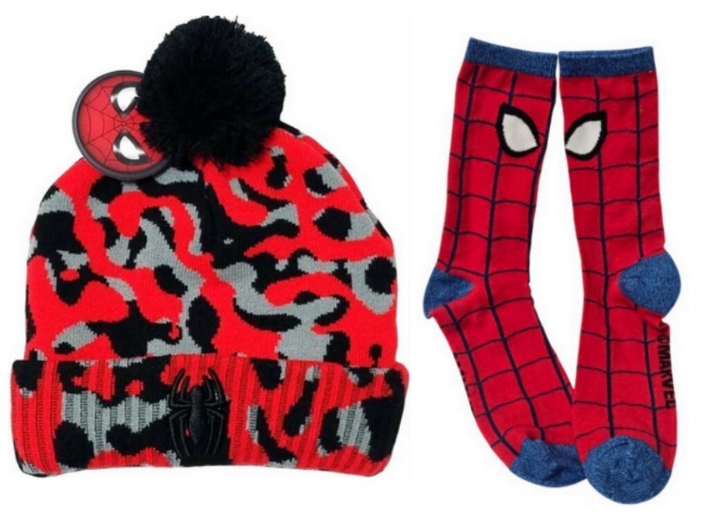 This item is a Marvel Spider-Man Adult/Youth 2-piece gift set that includes a beanie hat with a Pom-pom and a pair of crew socks.