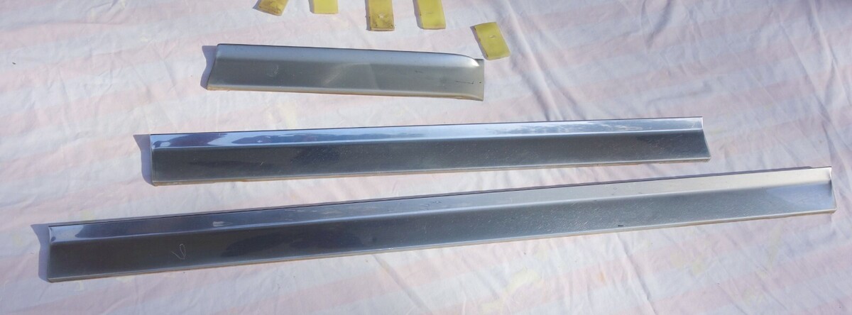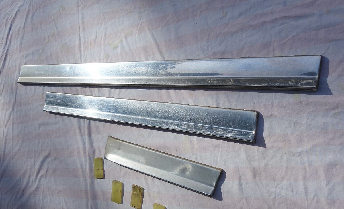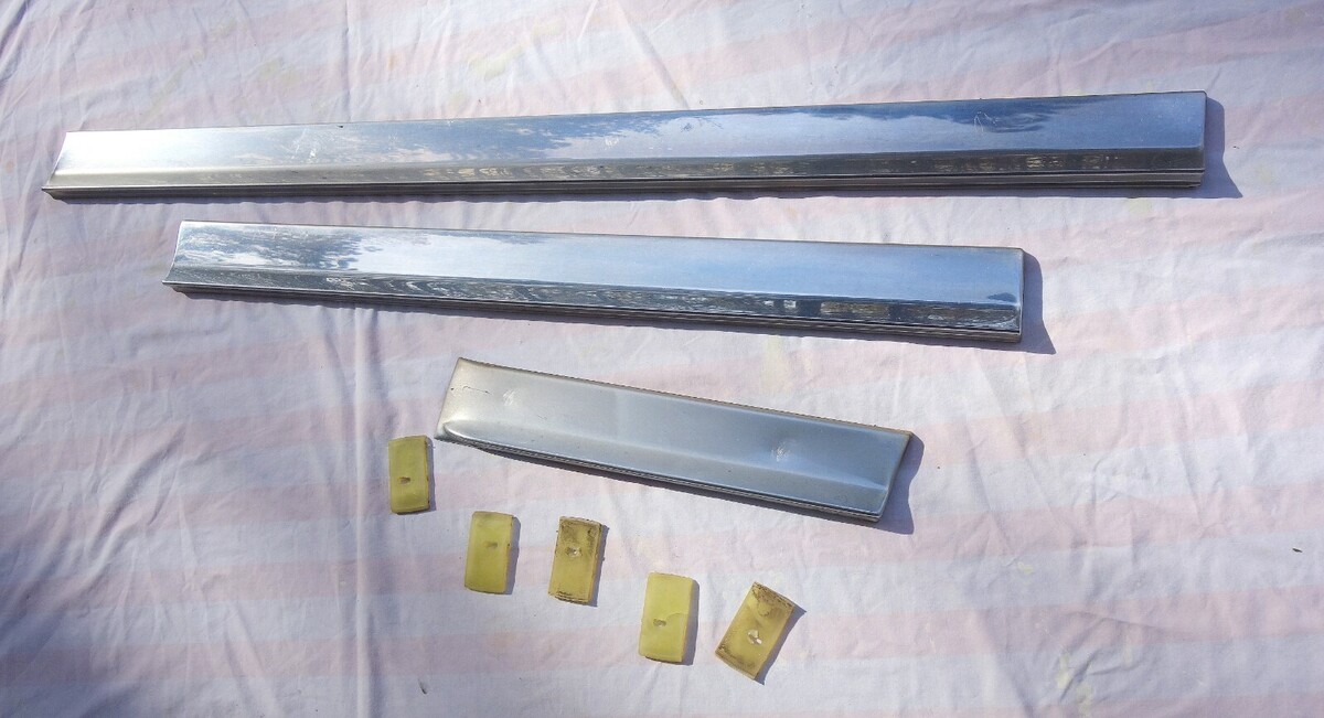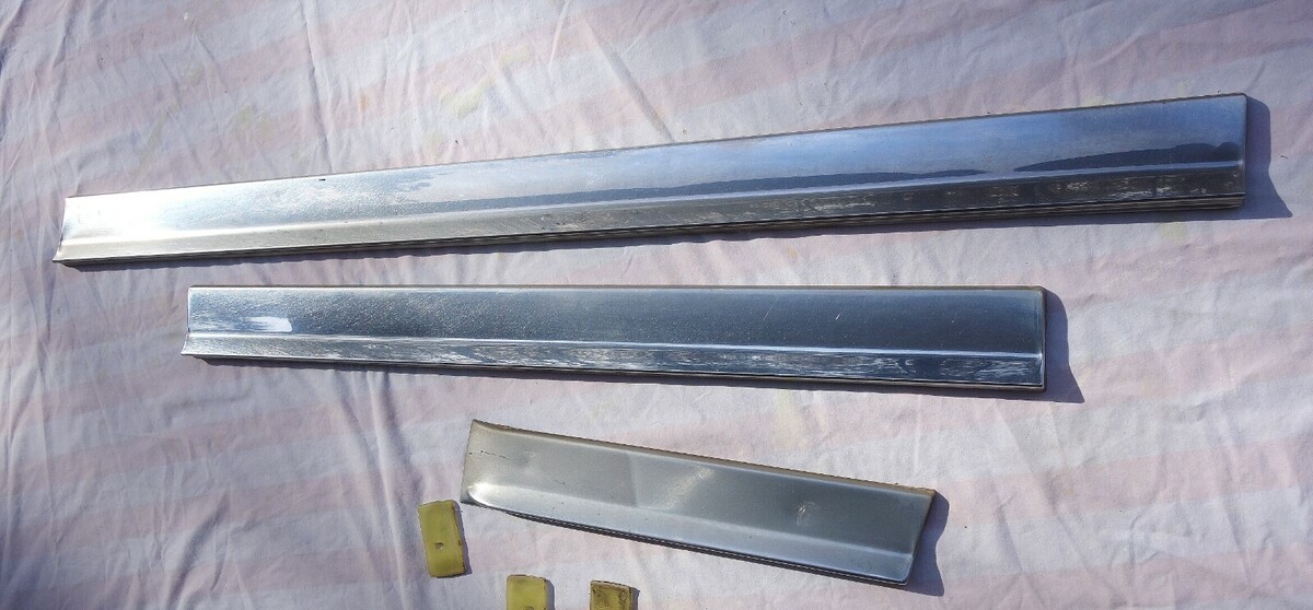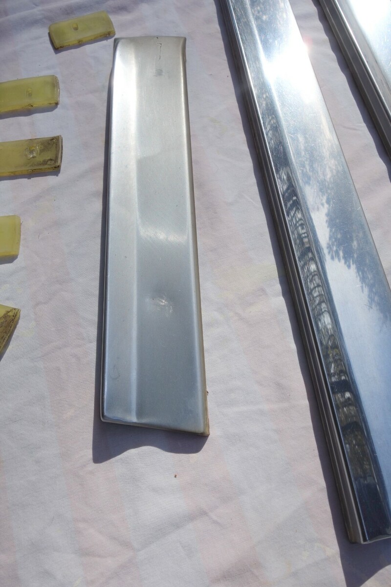 1974 FOUR DOOR CADILLAC FLEETWOOD BROUGHAM RIGHT SIDE STAINLESS STEEL LOWER DOOR MOLDING TRIM. INCLUDES TRIM FOR FRONT AND REAR RIGHT SIDE ( PASSANGER SIDE ) DOORS AND RIGHT SIDE FRONT FENDER. INCLUDES SOME OF THE MOUNTING CLIPS AS WELL. TRIM IS IN GOOD SHAPE OTHER THAN A FEW SMALL DINGS/DENTS/SCRATCHES. MAY FIT OTHER MAKES AND MODELS AS WELL. Sold as is !!!!!! Items I sell May have minor scratches / scuffs / dings / dents / cracks / rust or paint loss !!!!