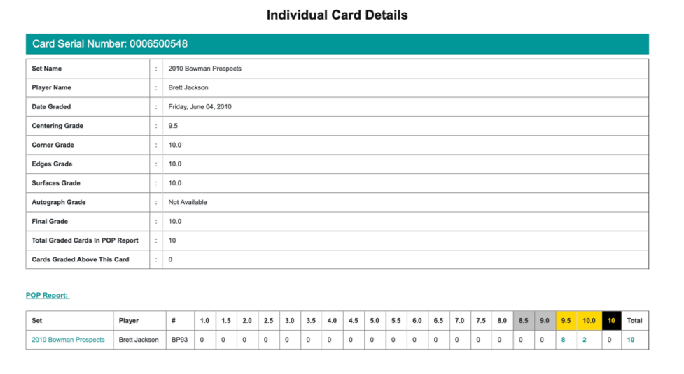 2010 Bowman Prospects Brett Jackson Rookie Beckett 10 PRISTINE