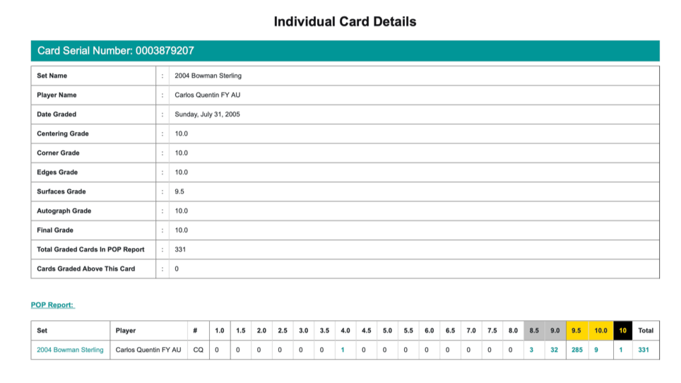 2004 Bowman Sterling #CQ Carlos Quentin AU Rookie Beckett 10 PRISTINE