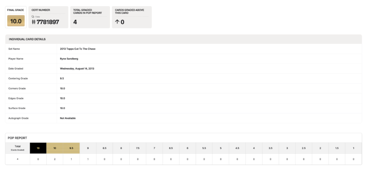 2013 Topps Cut To The Chase Ryne Sandberg Cubs Beckett 10 PRISTINE