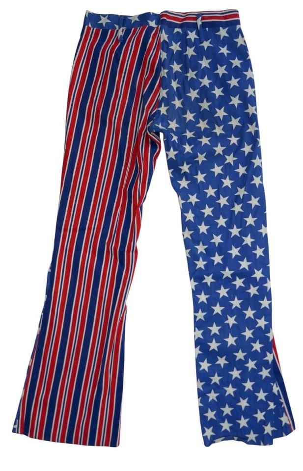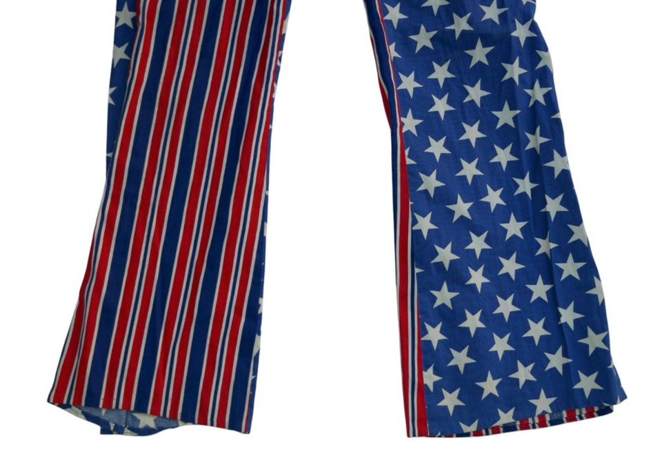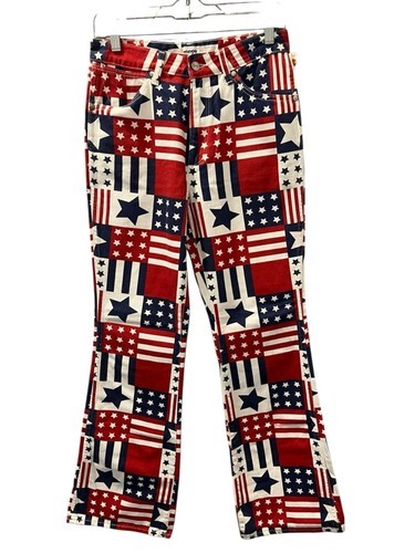 This is a pair of vintage Male Slacks Jeans with an American flag design of stars and stripes. The pants feature a mid-rise fit with a flared style, classic denim fabric, and a multicolor striped pattern. They measure approx. 14.5" across the waist with 29.5" inseam. These do have some flaws due to age - yellowing, small spots and torn fabric around the fastener. Perfect for summer, fall, and spring, these slacks offer a comfortable and stylish option for women looking to make a statement.