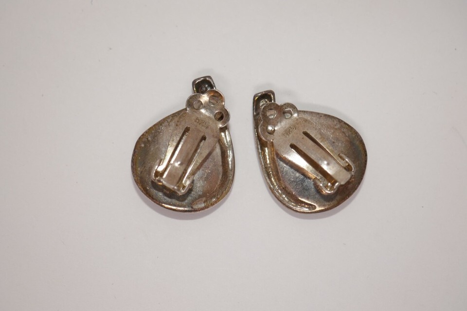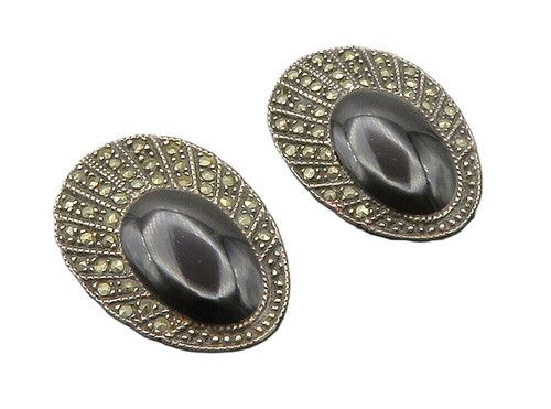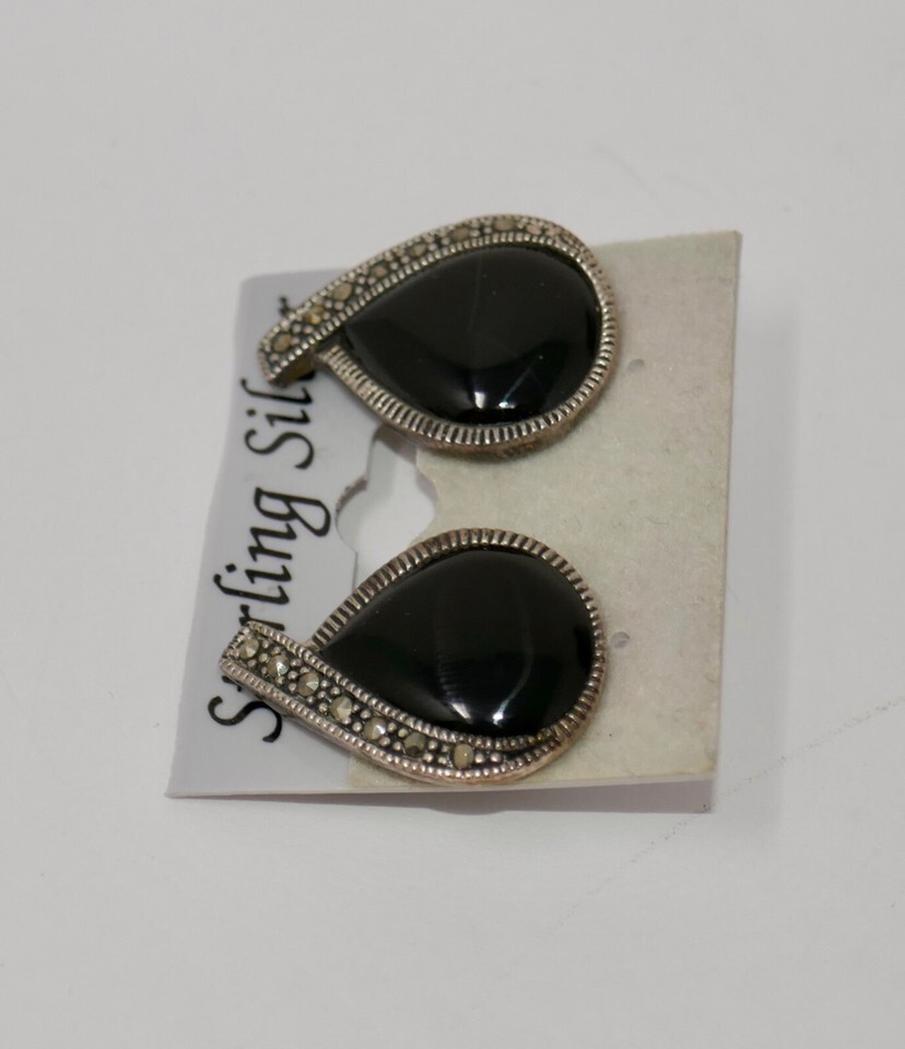 Sterling Silver 925 Black Onyx Marcasite Teardrop Clip On Earrings