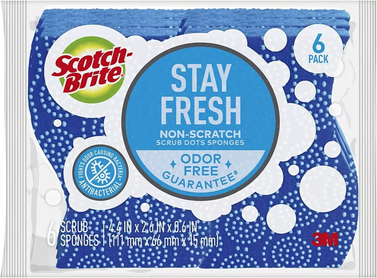 SIX SCRUBBING SPONGES: One package of Scotch-Brite Stay Fresh Non-Scratch Scrub Dots Sponges; one pack contains six sponges.