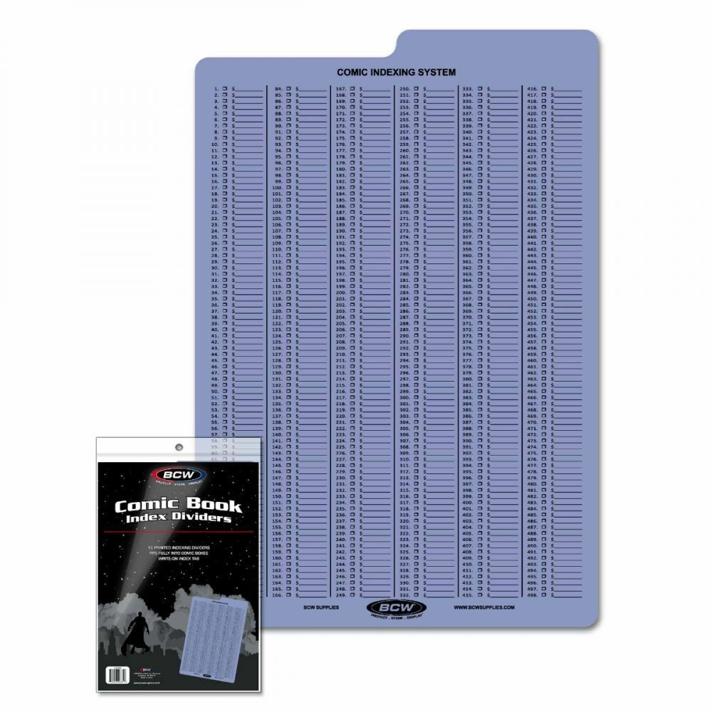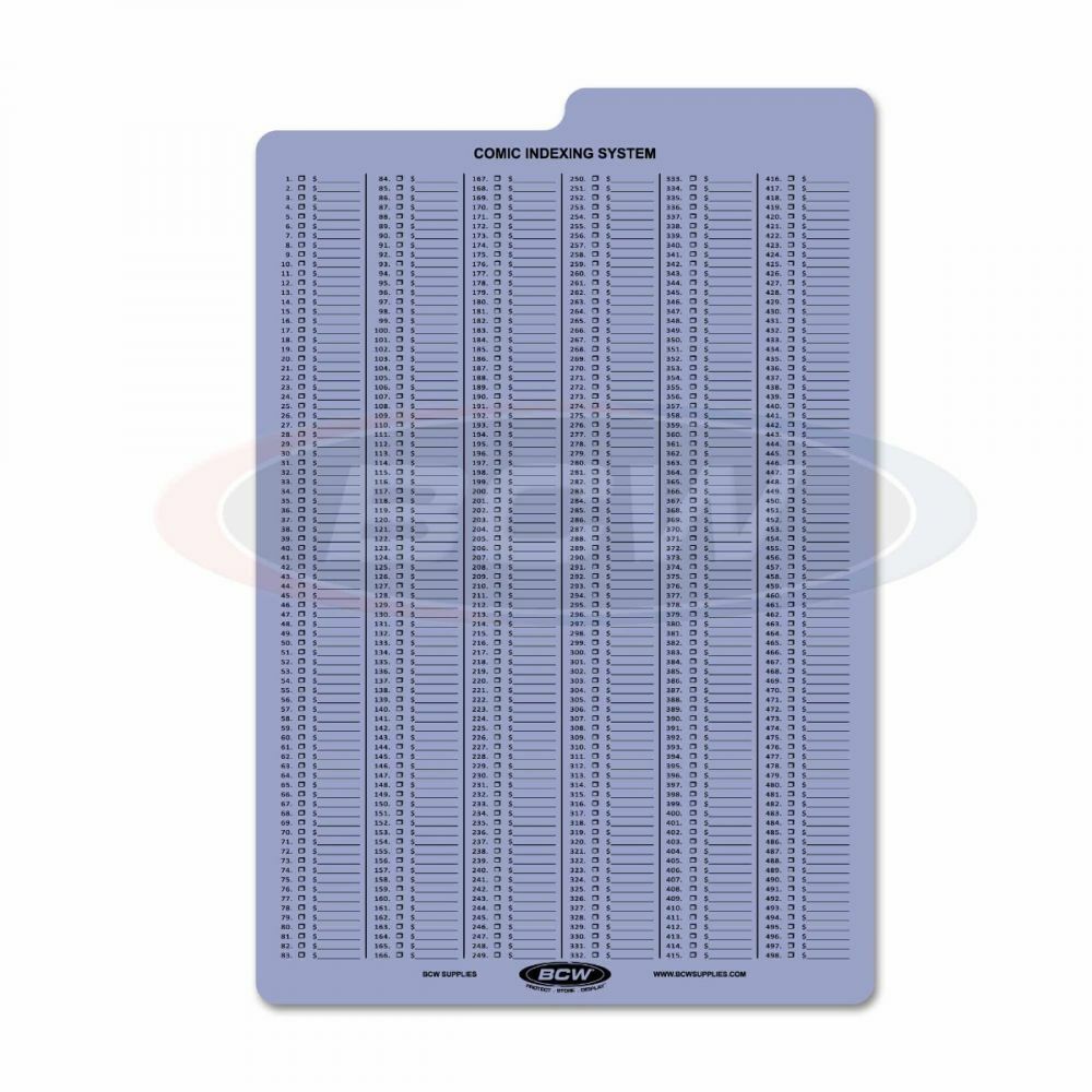 The BCW Comic Index Dividers are made from a full 30 point pale blue high density Polyethylene Plastic (archival quality), with write-on index tab, and are precision cut to size. With printed Comic Indexing System check off issues from 1 to 498,and include issue price.