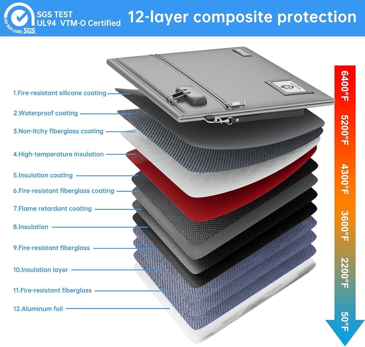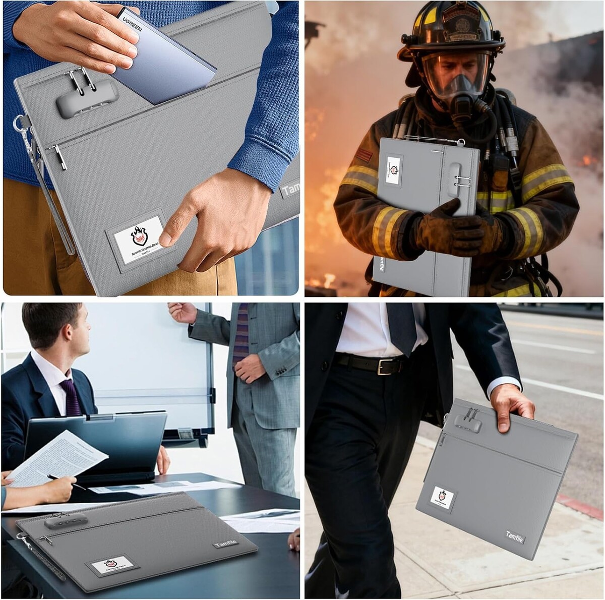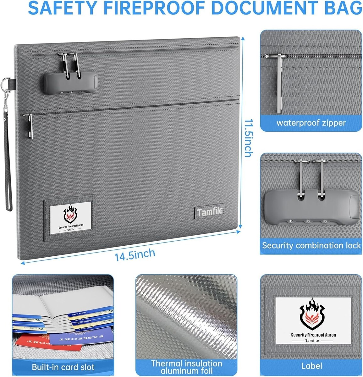 Fireproof Document Bag with Lock 6400℉ Valuables Cash Fire Safe 14.5 x 11.5 Grey
