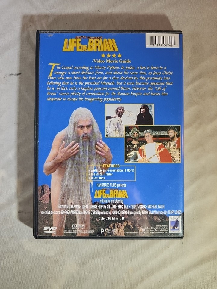 Monty Python's Life of Brian is a classic comedy film released on DVD in 1999 by Handmade Films. (the original movie was released in 1979.) The DVD format allows for easy viewing and enjoyment of this beloved comedy masterpiece, perfect for fans of Monty Python and comedy enthusiasts alike.