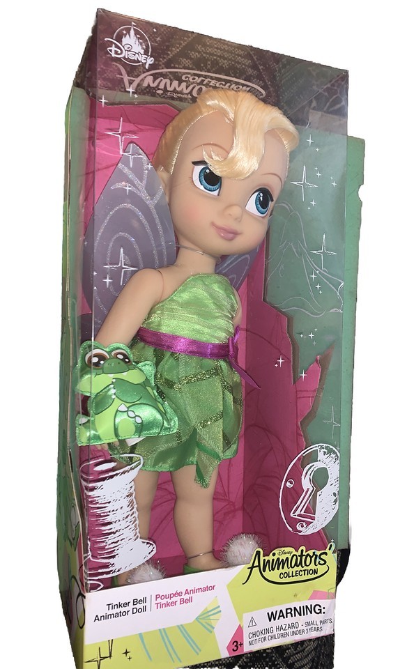 This Disney Animators Collection play doll features Tinker Bell and her companion Baby Tick Tock the Crocodile. The 16-inch doll has blonde hair and blue eyes, and comes in its original unopened packaging. The doll is part of the Disney franchise Peter Pan and the Animators Collection series, and is a store exclusive item from 2010-2019.
