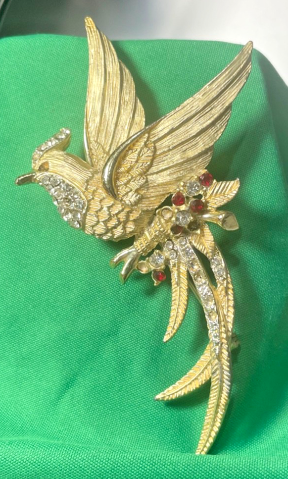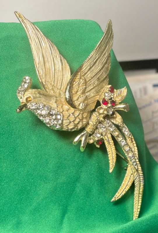 The product is a unique and elegant vintage brooch in the shape of a bird, featuring simulated multicolor stones set in gilt metal. It is a reproduction piece from the United States, This fashion accessory is perfect for women who appreciate vintage jewelry with a touch of history and charm. The intricate design and vibrant colors make this brooch a standout piece for any outfit or collection. This is costume jewerly and has a couple stones missing.