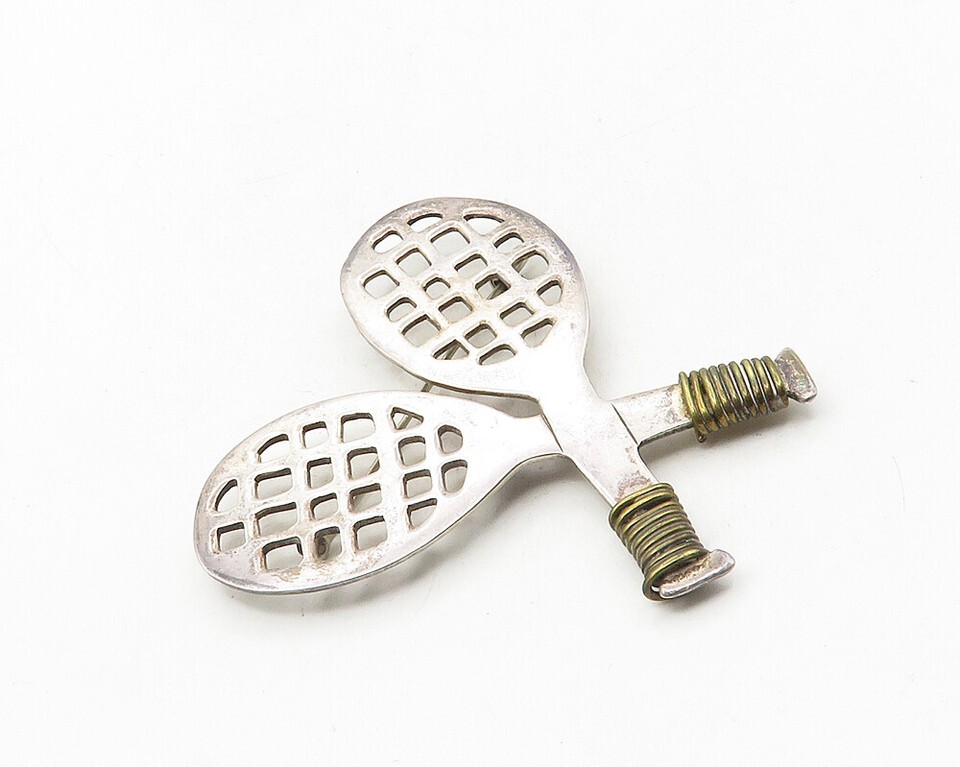 MEXICO 925 Sterling Silver Vintage Tennis Rackets Sports Brooch Pin BP4120