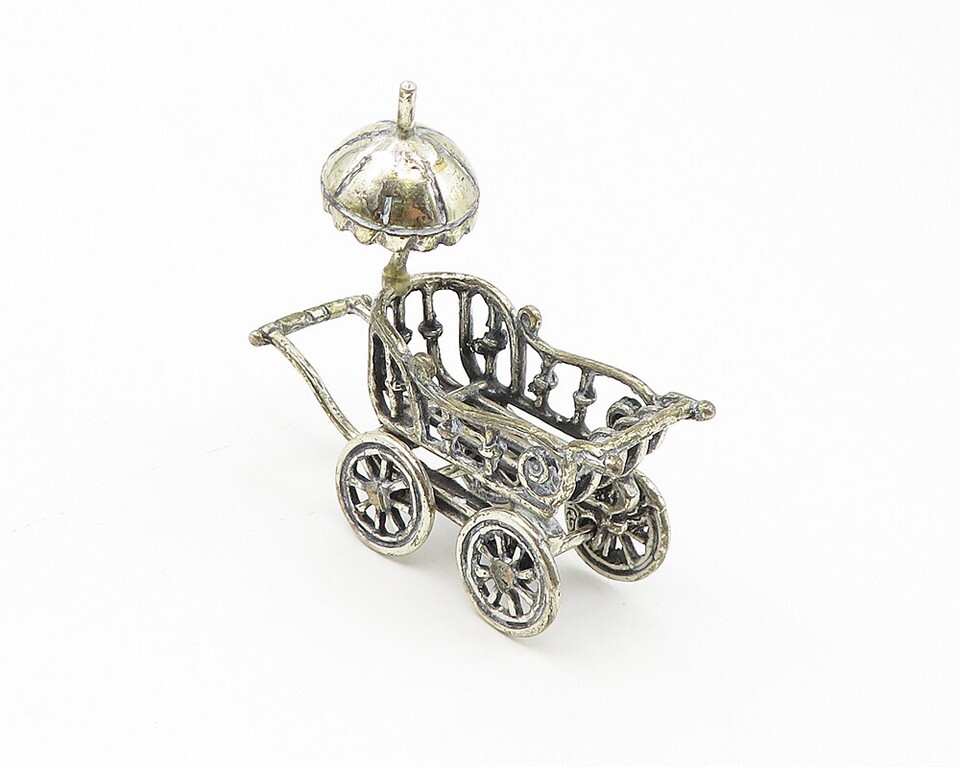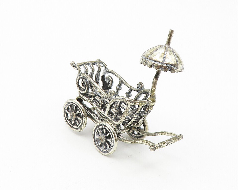 925 Sterling Silver Vintage Shiny Old Fashioned Baby Carriage Trinket TR1823