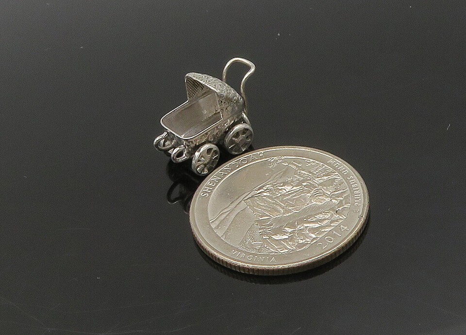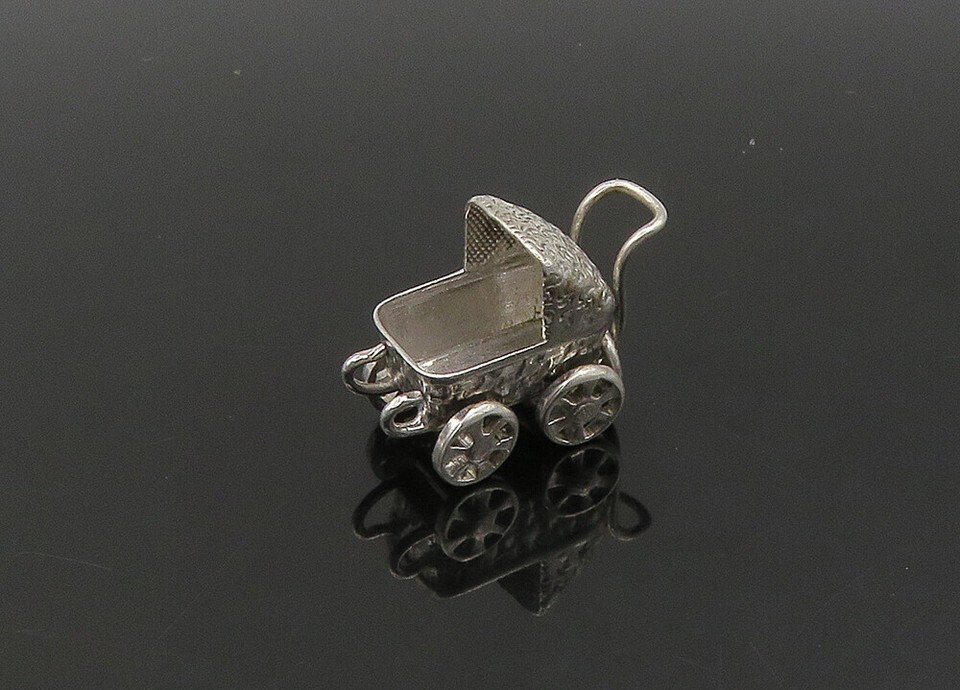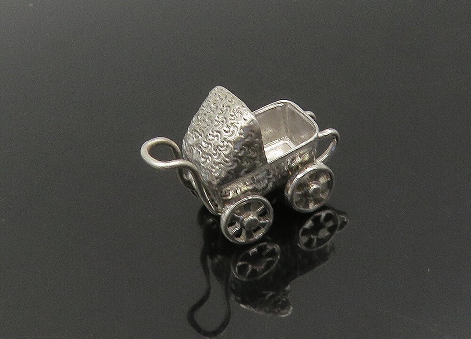 925 Sterling Silver Vintage Old Fashioned Baby Carriage Pendant PT17748