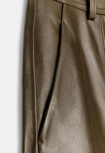 Trousers khaki made from 100% leather. Mid-rise and waistband with belt loops. Front and back pockets. Matching topstitching detail. Zip fly and button fastening.
