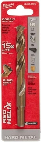 The Milwaukee Red Helix Cobalt 7/64 in. Drill Bit are engineered for extreme durability and longer life in hard metal applications. The Milwaukee Cobalt drill bits are designed with a Variable Helix that includes an aggressive 35 degree Helix Angle which ends at 15 degree. The 135 degree split point tip delivers a precision start and prevents walking for fast, accurate holes in hard metals, PVC and wood. The tapered drill bits feature a new enhanced tapered web that strengthens the bit's core to increase flute durability. The cobalt twist drill bits are ideal for tough applications, providing up to 15X life vs. black oxide brill bits.