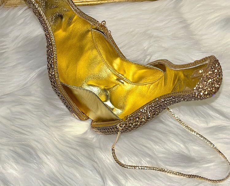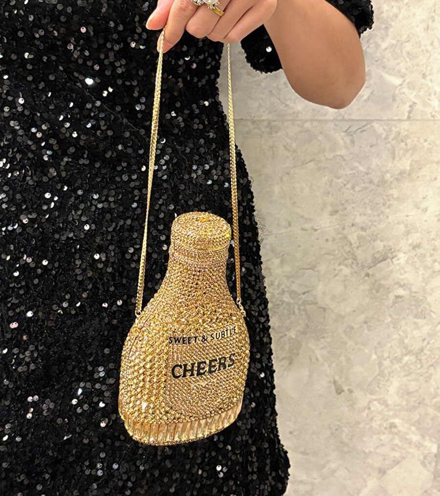 Product description: Make a dazzling entrance with this Crystal Champagne Bottle Clutch Bag, a head-turning evening accessory that transforms the iconic bubbly vessel into wearable art. Meticulously adorned with sparkling rhinestones and crystals, this statement piece captures and reflects light from every angle, creating an unforgettable shimmer. The authentic bottle silhouette features distinctive CHEER branding, making it an instant conversation starter. This versatile clutch includes a removable gold chain strap, allowing you to wear it crossbody, over the shoulder, or carry it as a handheld clutch. The interior provides ample space for evening essentials like your phone, cards, and makeup. Perfect for weddings, galas, parties, and New Year's celebrations, this unique accessory combines whimsy with sophistication to create an unforgettable style statement that sets you apart from the crowd.