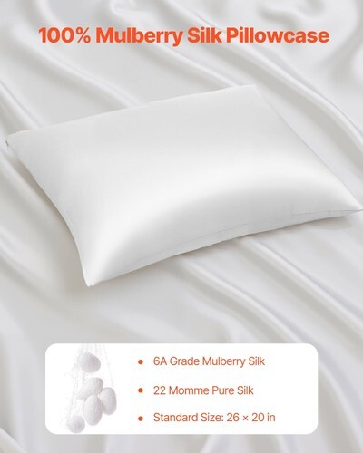 6A Grade Pure Mulberry Silk: This silk pillowcase is made of 100% pure mulberry silk with 6A grade and 22 momme. Its smooth, refined texture feels soft, breathable, and skin-friendly-ideal for a restful and luxurious sleep.