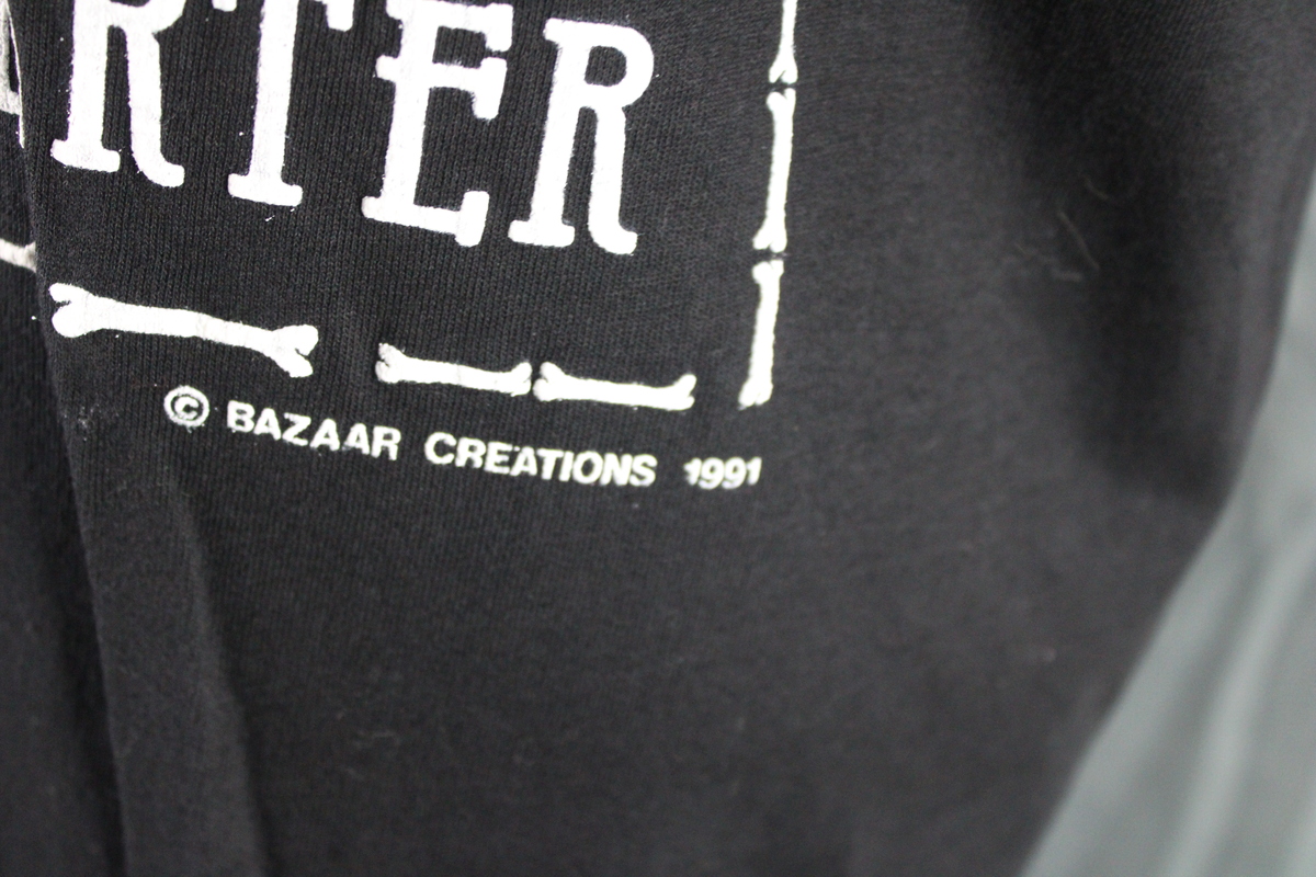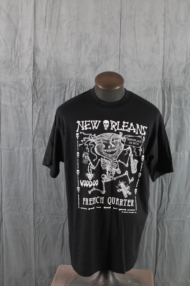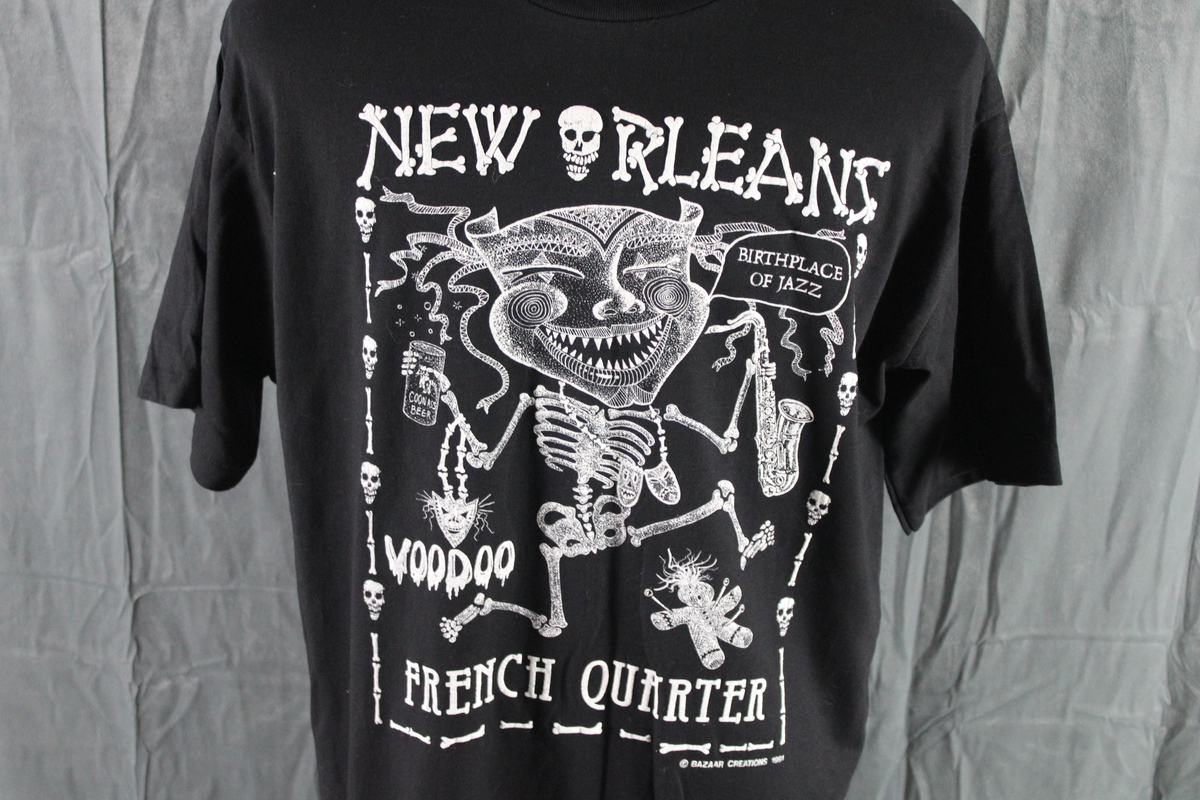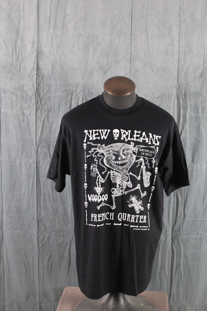 Up for sale is a vintage graphic t-shirt. It has a black base colour with a lrage white puffer graphic screened on the chest. The graphic has New Orleans spelt in bones on the top. There is a demon with saxaphone screened on the chest with French Quarter underneath. What a great shirt do not miss out on it.
