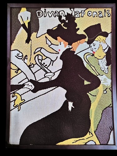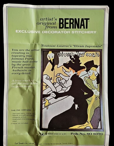UP FOR SALE: Artist's Original From: Bernat Exclusive Decorator Stitchery Kit Toulouse-Lautrec's Divan Japonais No SO-8070 (fits stretcher size 14" x 19" when finished and Framed)