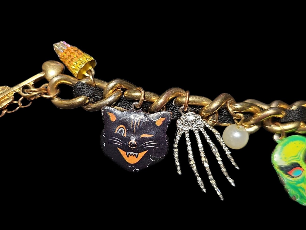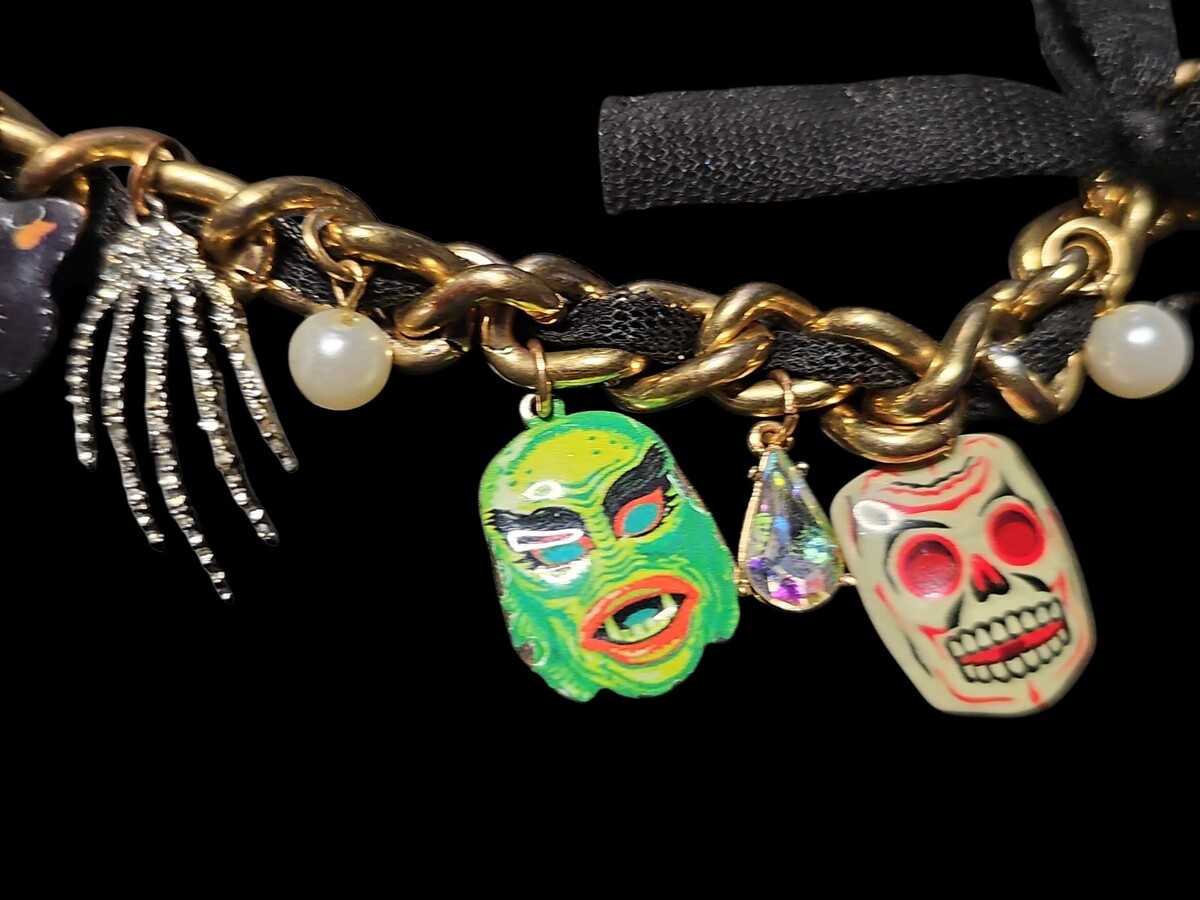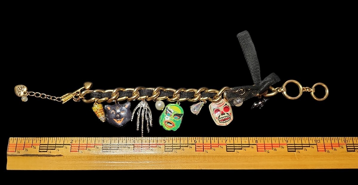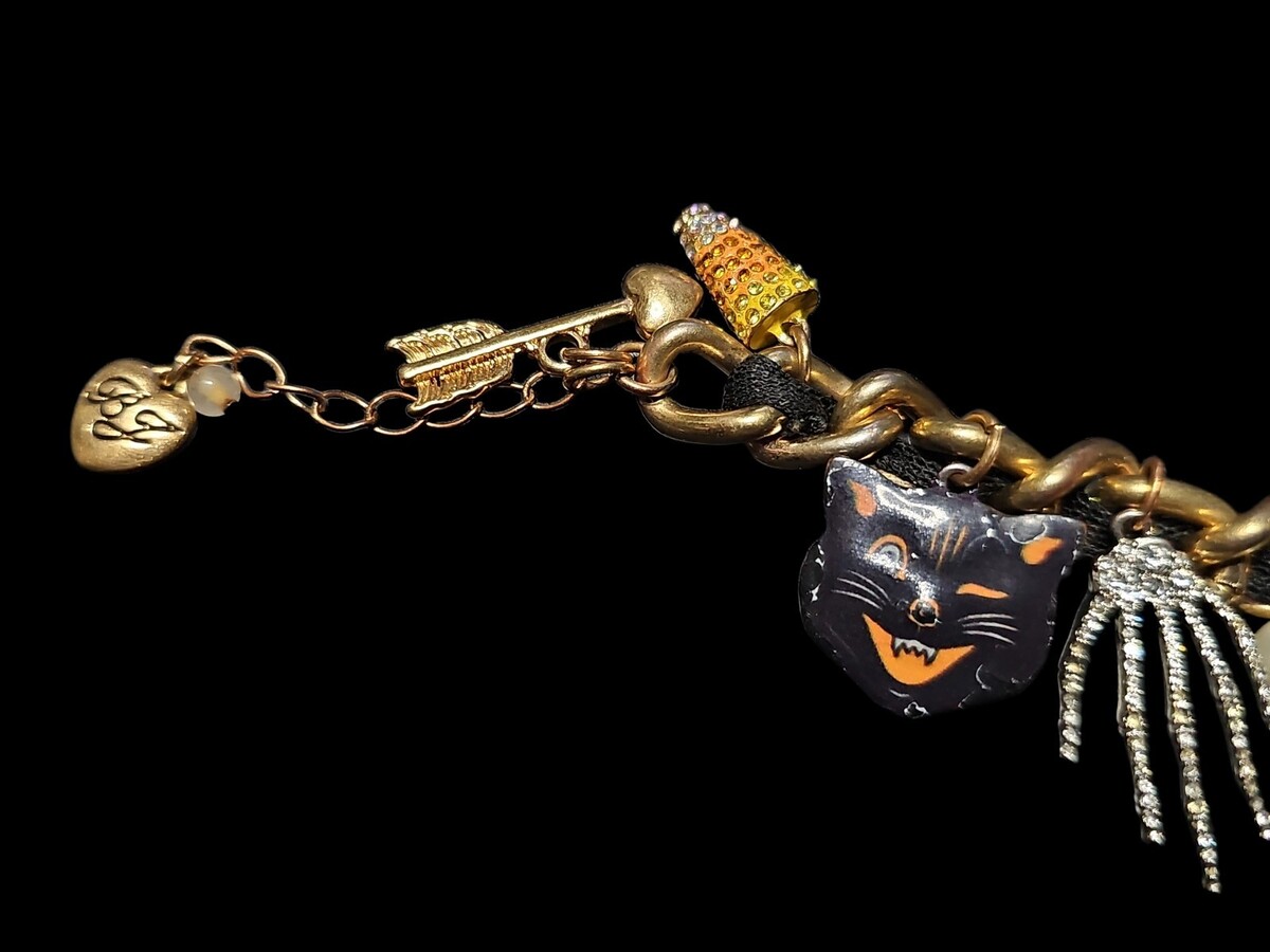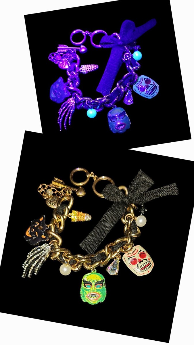 Betsey Johnson Glow in the Dark Halloween Charm Bracelet Skull Bat Cat Alien