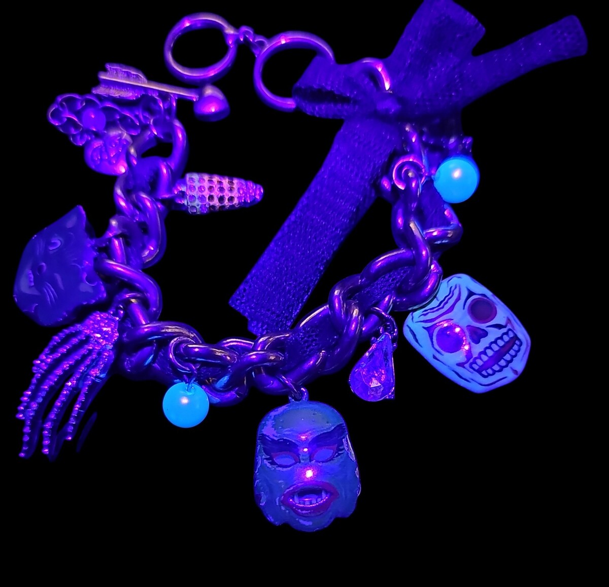 Betsey Johnson glow-in-the-dark Halloween charm bracelet featuring playful enamel and crystal charms including a skull, bat, cat, alien, and spooky hand motifs. Select charms glow under blacklight and in the dark, as shown in photos.