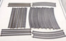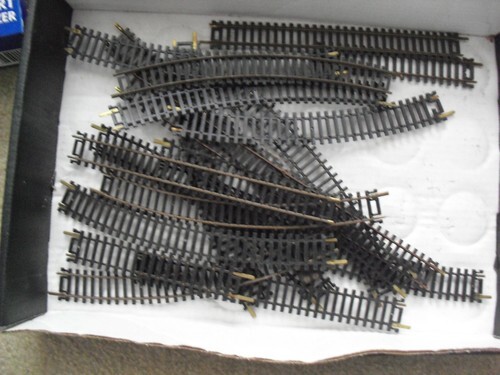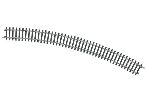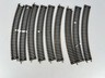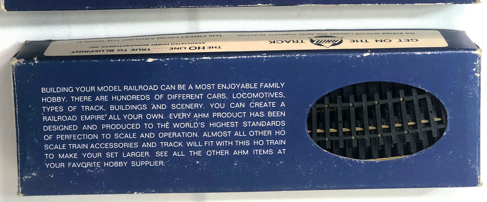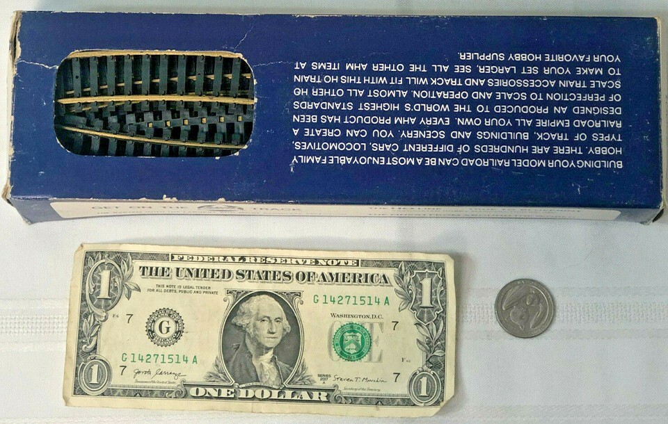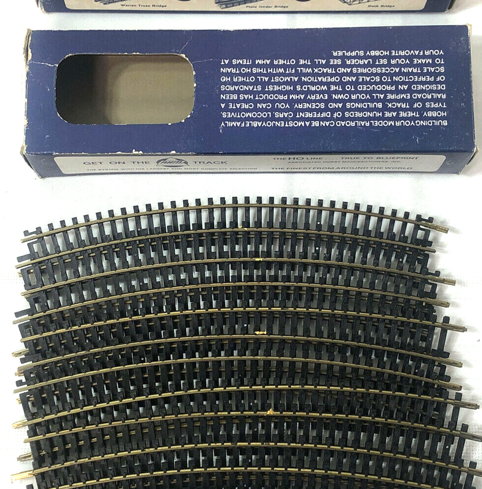 The AHM/Rivarossi HO 14 curved track is a vintage model railroad track made of black plastic and brass. It is designed for use with an analog AC power system and features a 2-rail-2-conductor rail system. This HO scale track is suitable for model train enthusiasts and collectors.