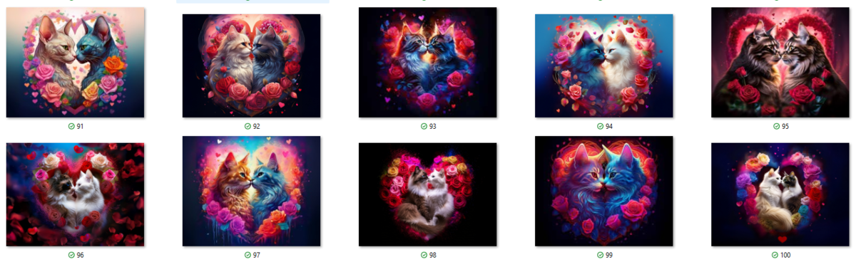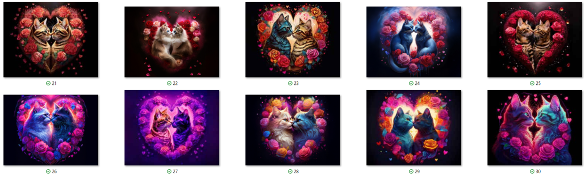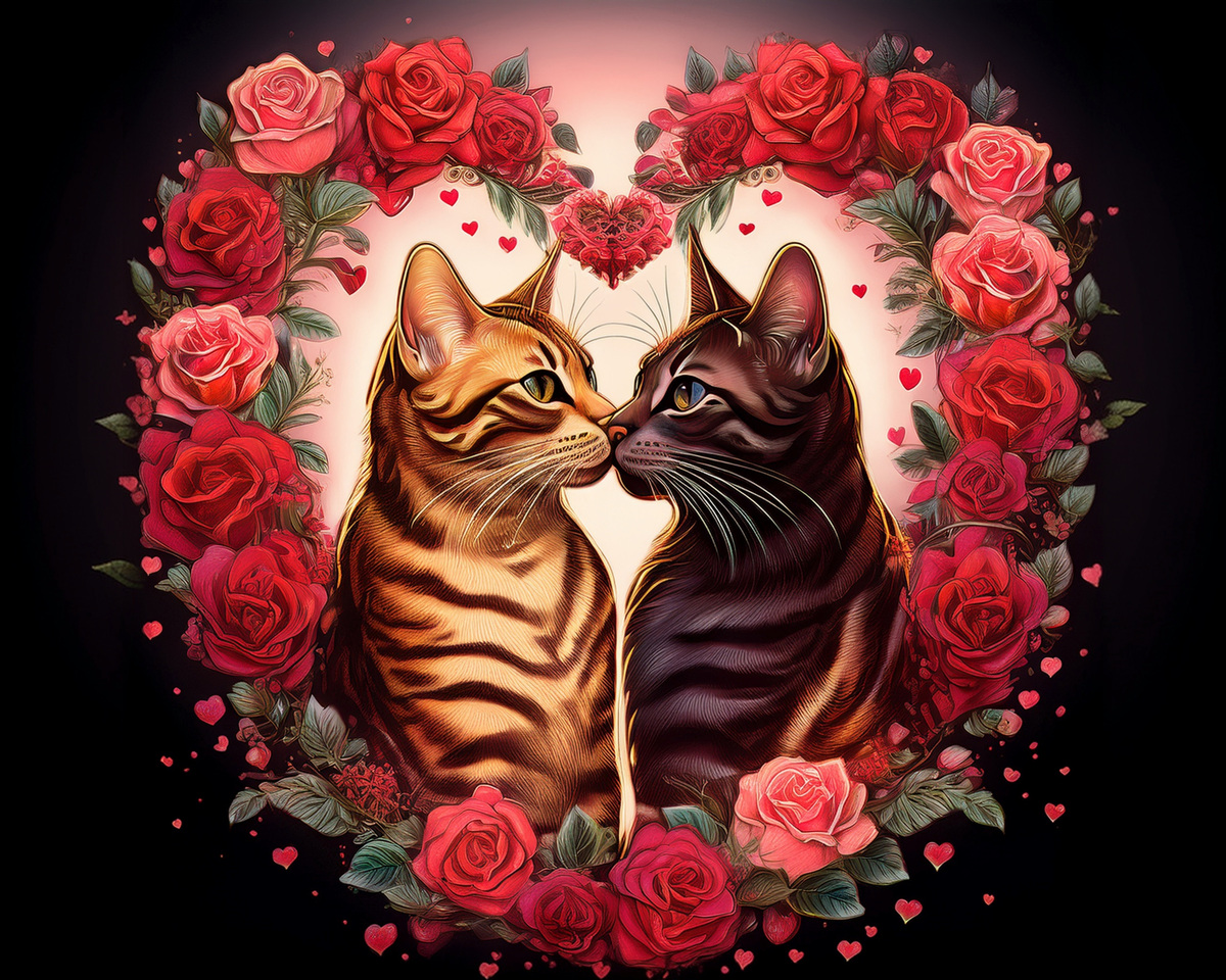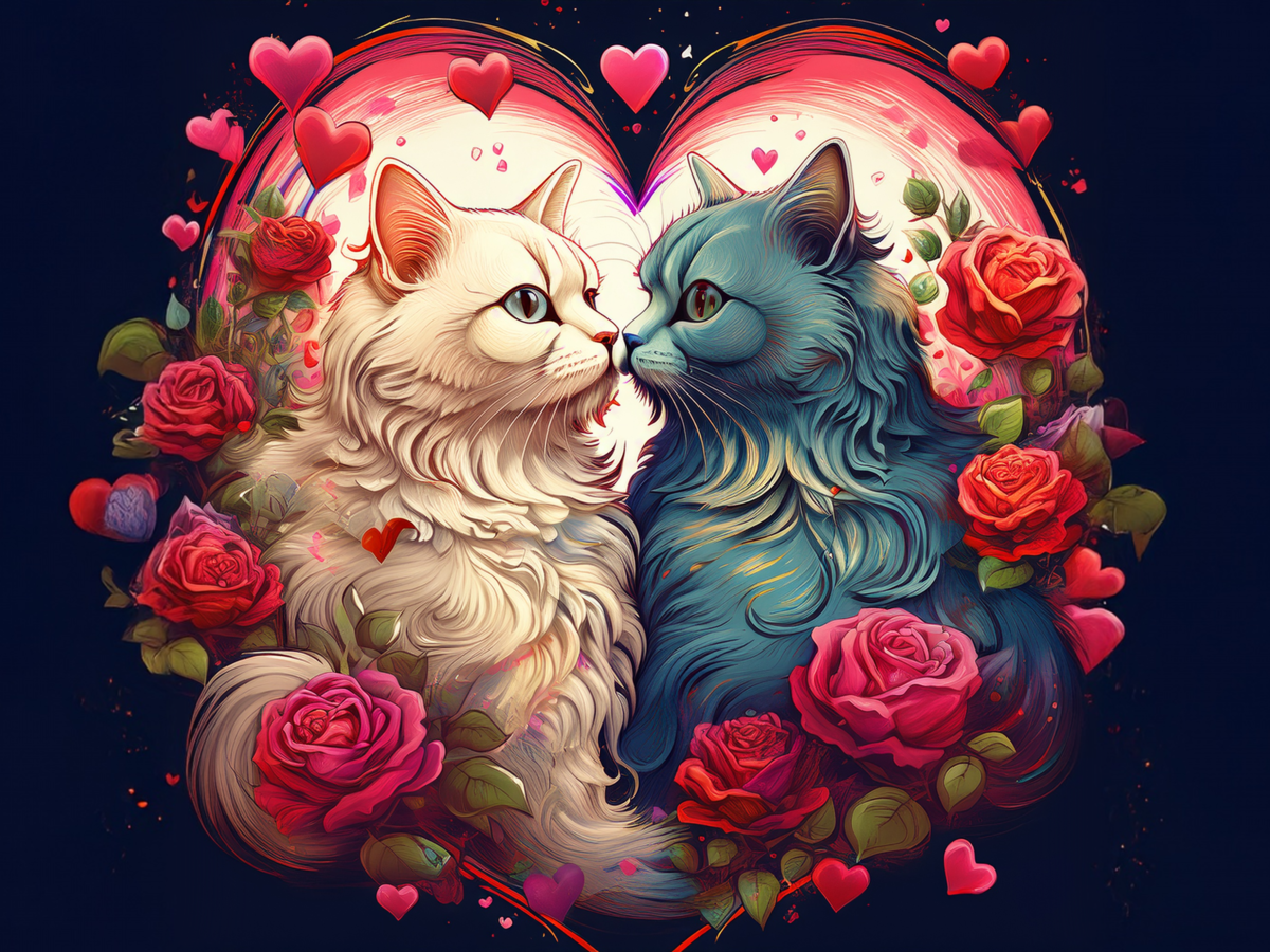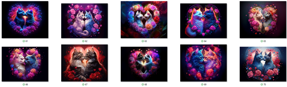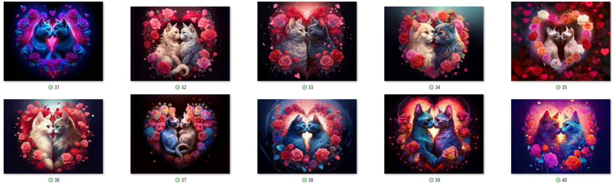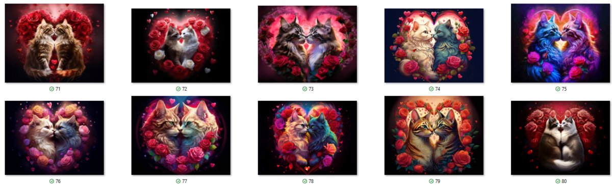 100 image bundle of Valentine cats featuring cute cat couples with roses and hearts.For commeercial use of physical products excluding transfers.