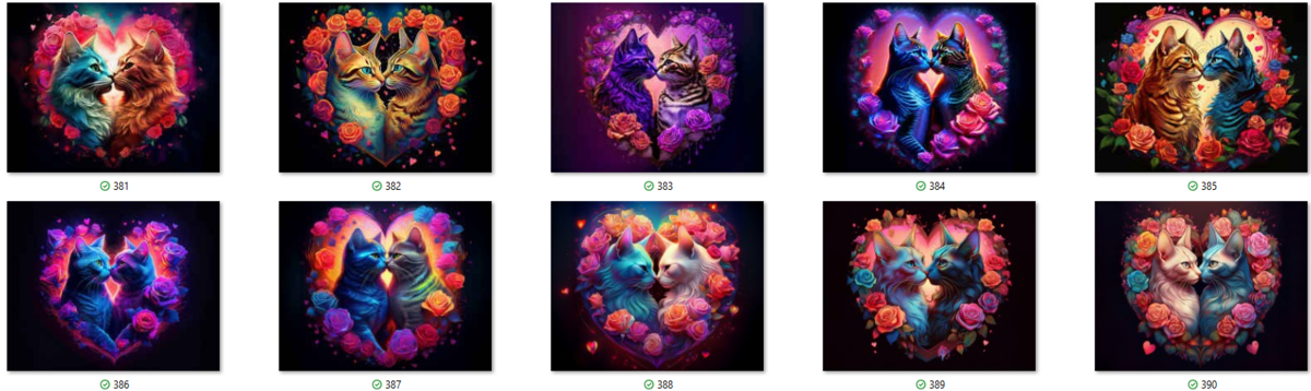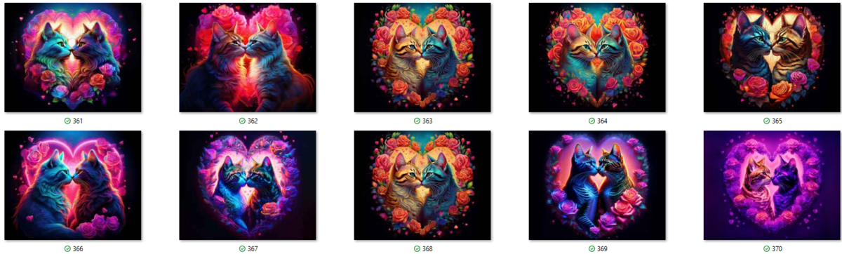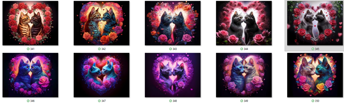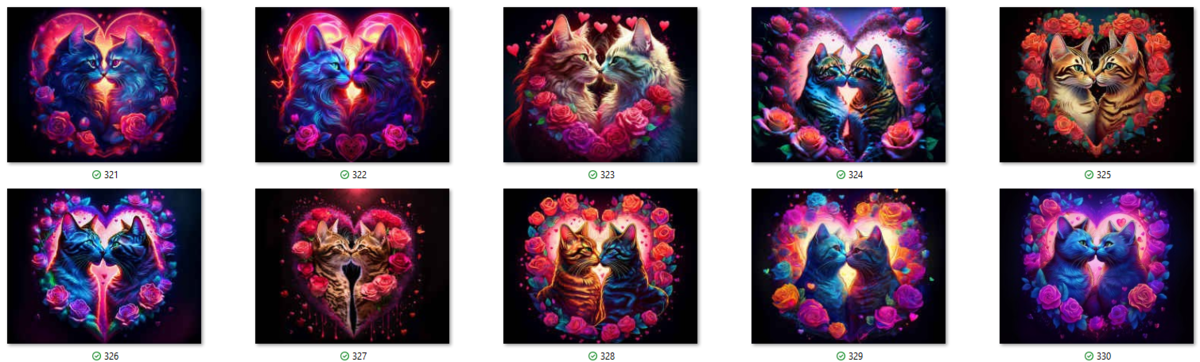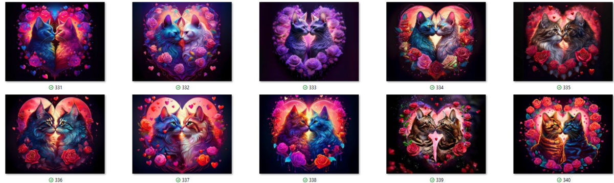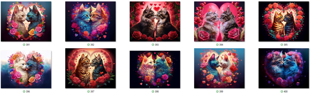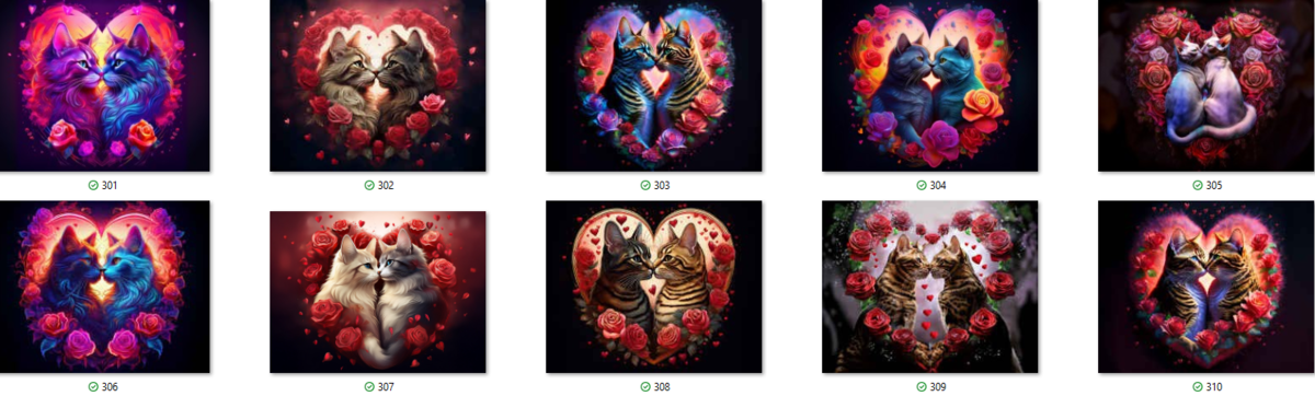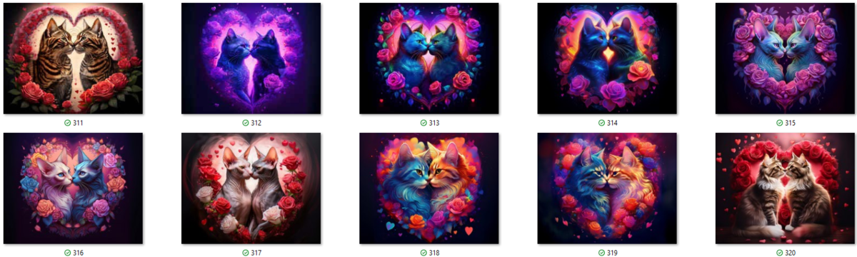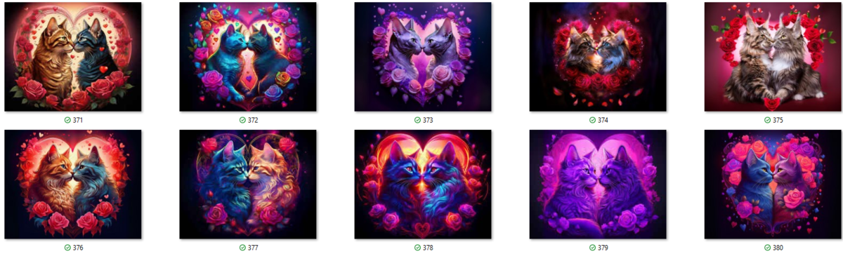 100 image bundle of Valentine cats featuring cute cat couples with roses and hearts.For commeercial use of physical products excluding transfers.