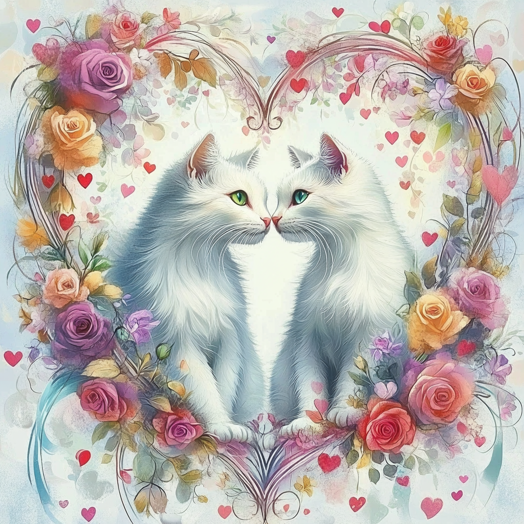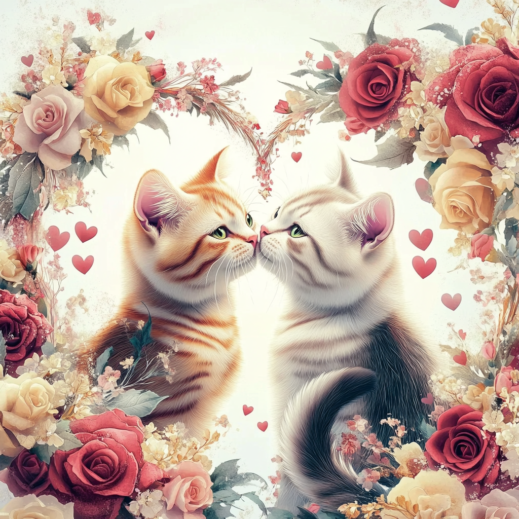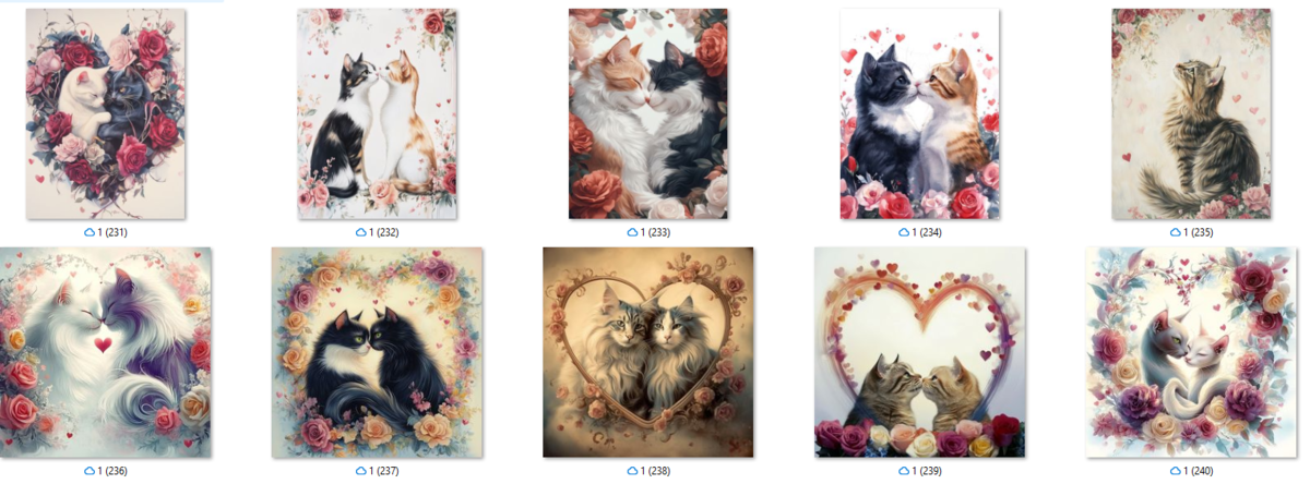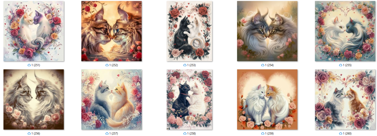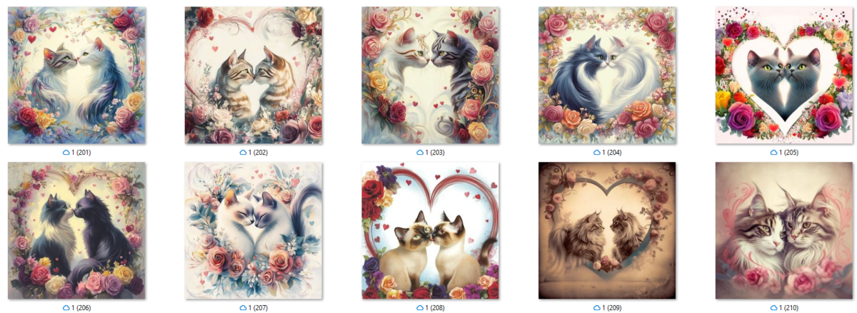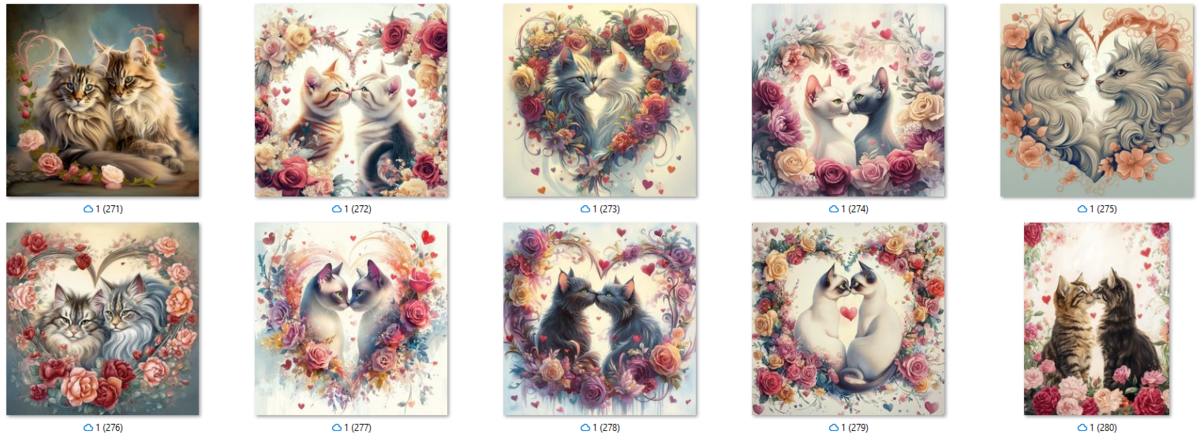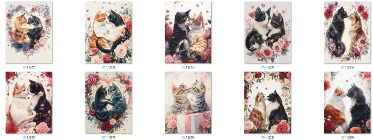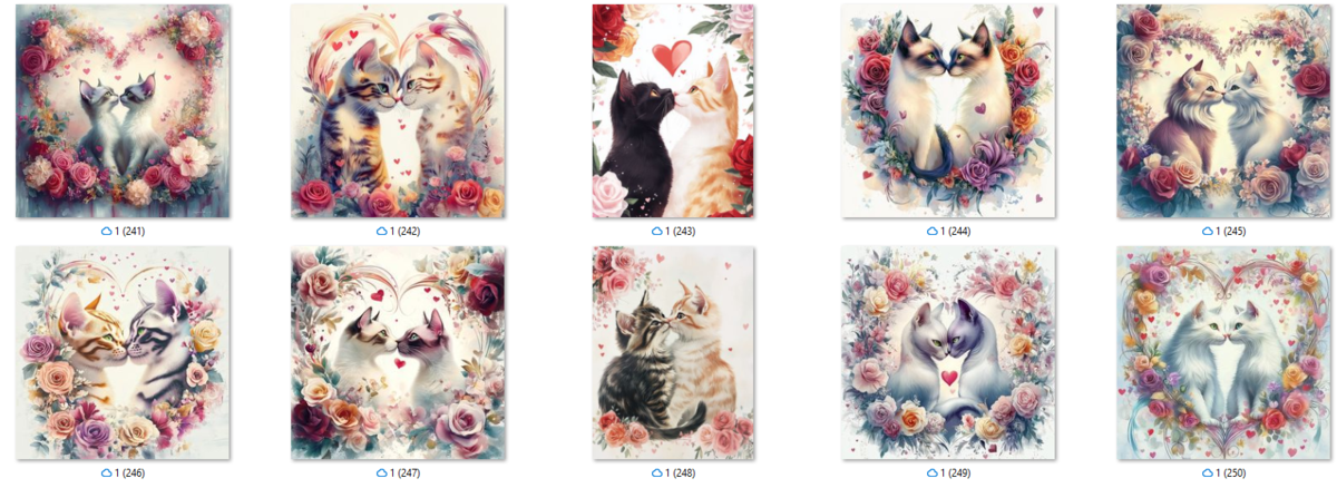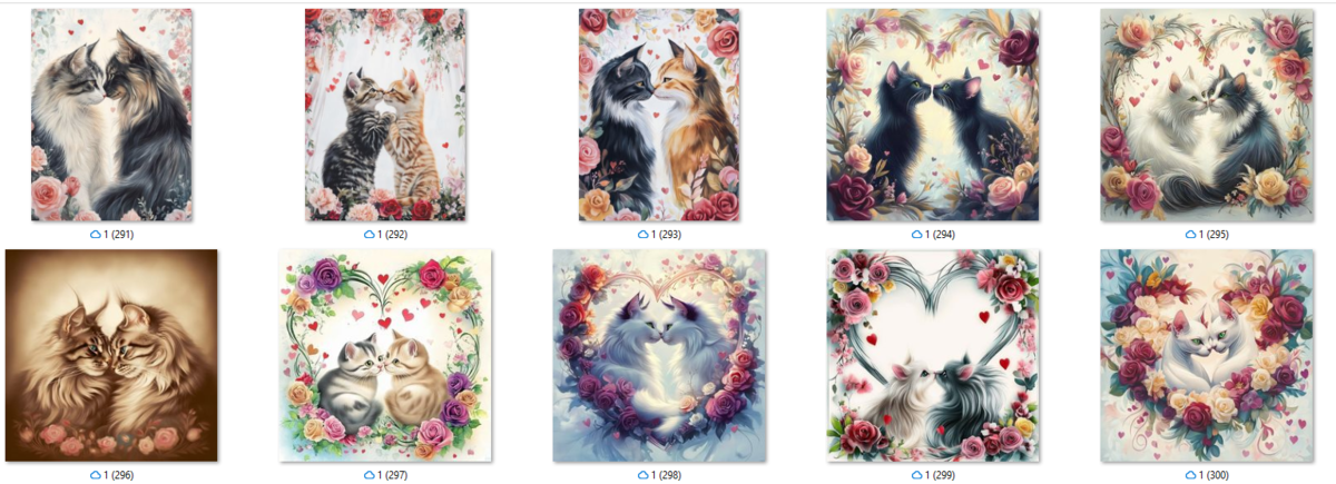 100 image bundle of Valentine cats featuring cute cat couples with roses and hearts.For commeercial use of physical products excluding transfers.