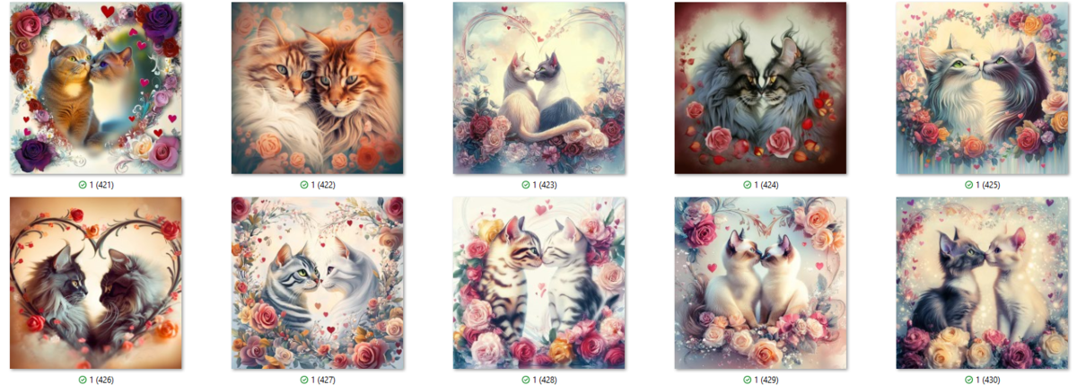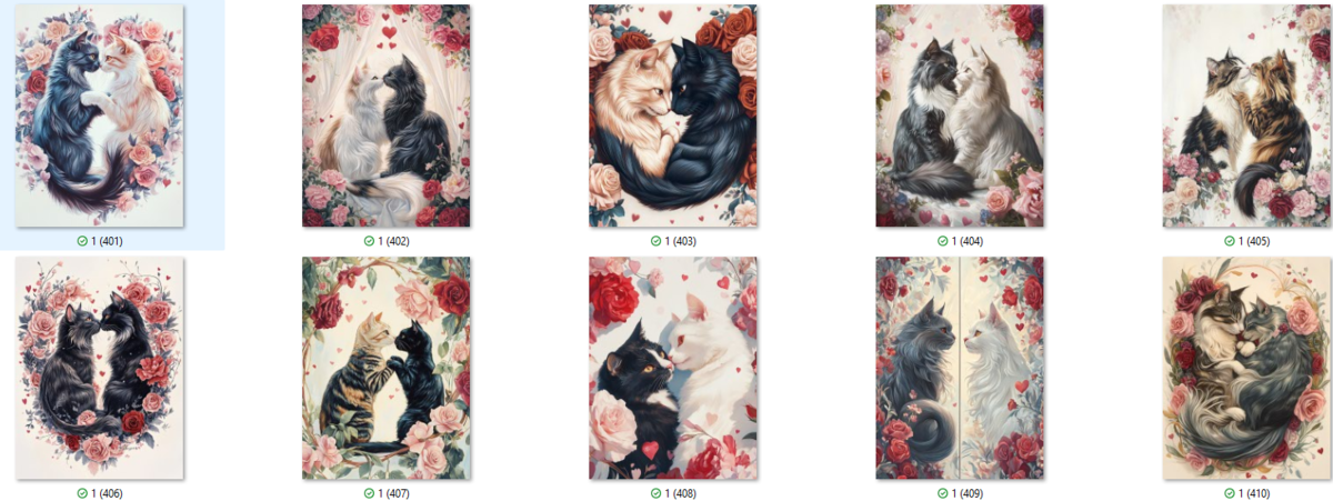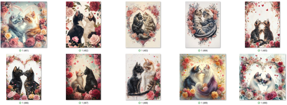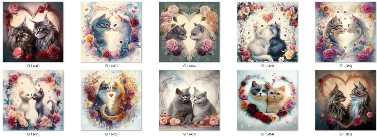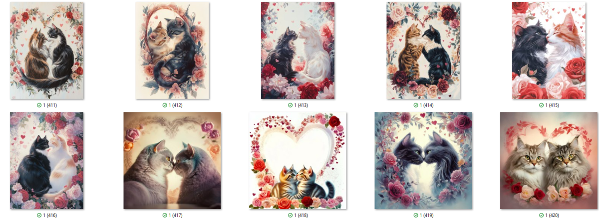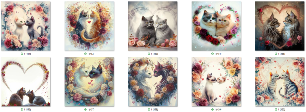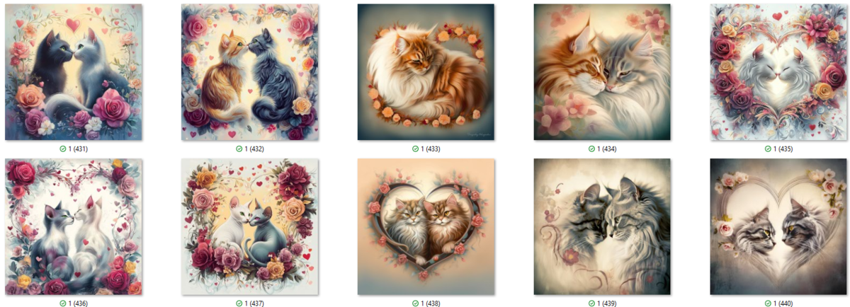 100 image bundle of Valentine cats featuring cute cat couples with roses and hearts.For commeercial use of physical products excluding transfers.
