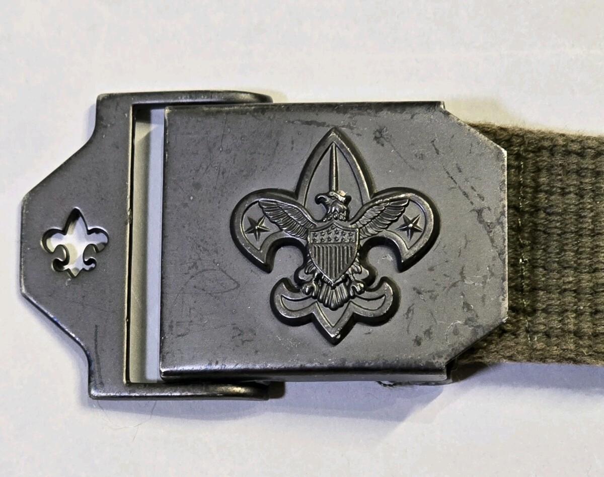Buckle and belt has wear and tear. Web belt has some fading and cut off end. The Boy Scouts Adjustable Web Belt with the BSA Logo Buckle in olive green is a historical memorabilia item that represents the fraternal organization. This belt is designed specifically for Boy Scouts and features a durable web material with an adjustable fit. The iconic BSA logo buckle adds authenticity to the piece, making it a collectible item that showcases a piece of scouting history.