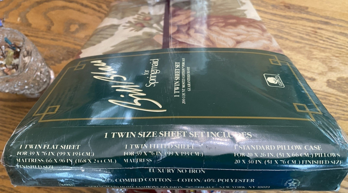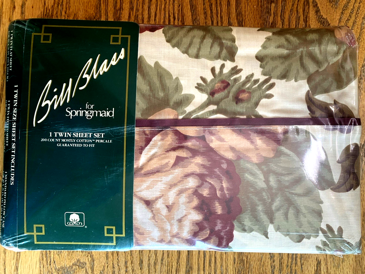 The Bill Blass for Springmaid Riande Neutral Twin Flat Sheet Set with Pillowcase is a vintage floral bedding set made in the United States during the 1980s. The set includes a rectangular flat sheet and pillowcase with a multicolor floral pattern, filled with a cotton blend material. The bedding is machine washable and features the original design by Bill Blass for Springmaid. Perfect for adding a touch of retro charm to any bedroom, this set embodies a classic style with a theme of flowers.