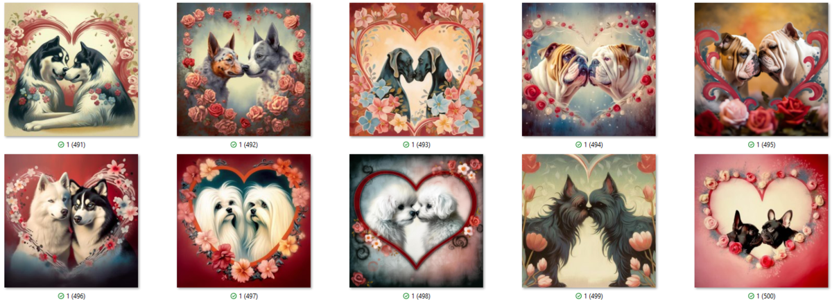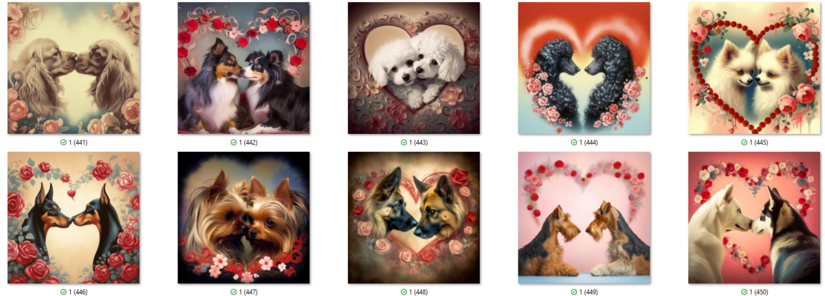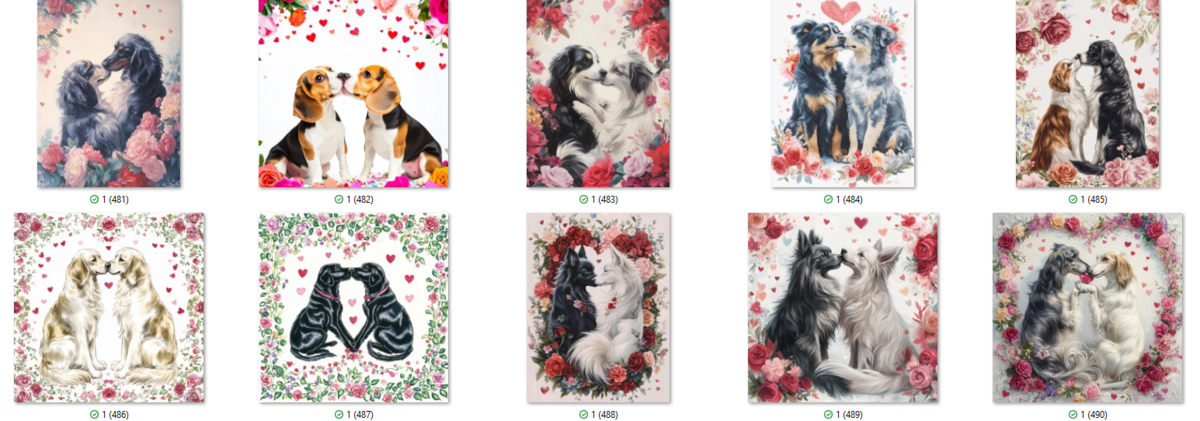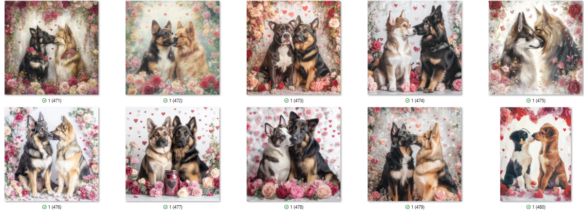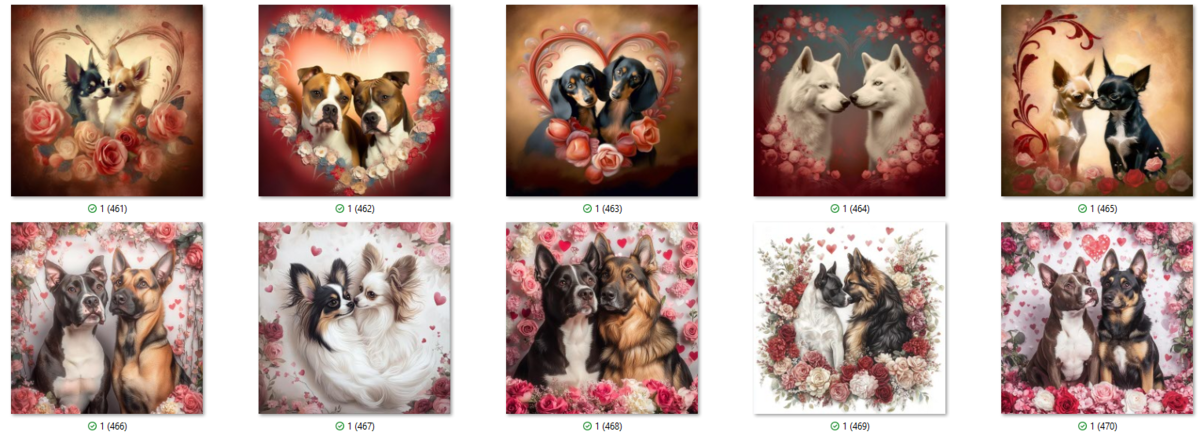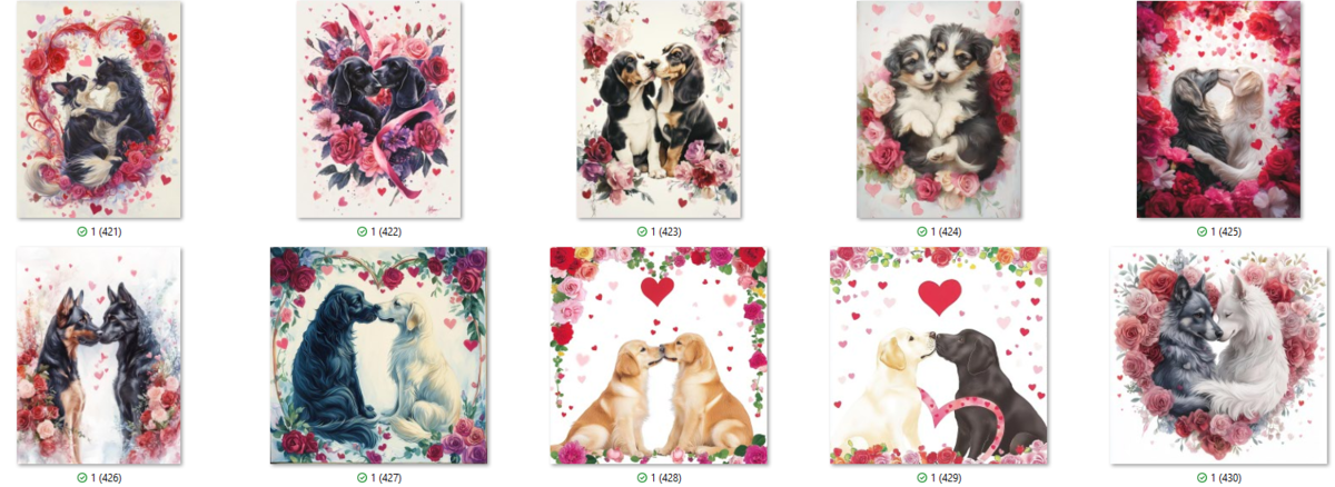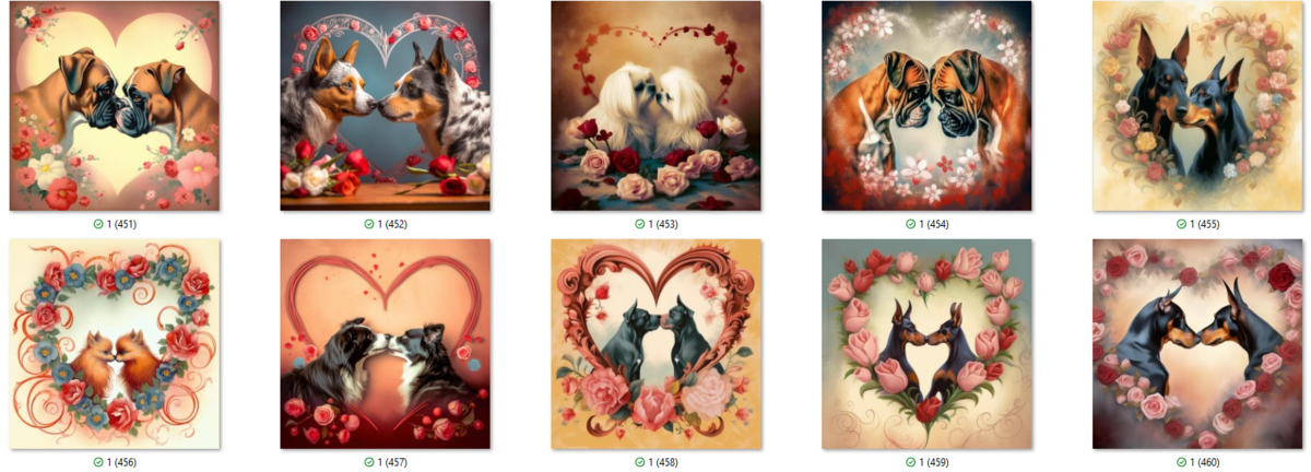 100 PNG image bundle of Valentine dogs featuring cute dog couples with roses, flowers and hearts.For commeercial use of physical products excluding transfers.