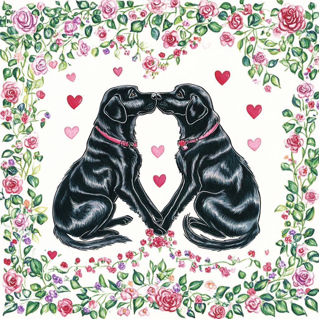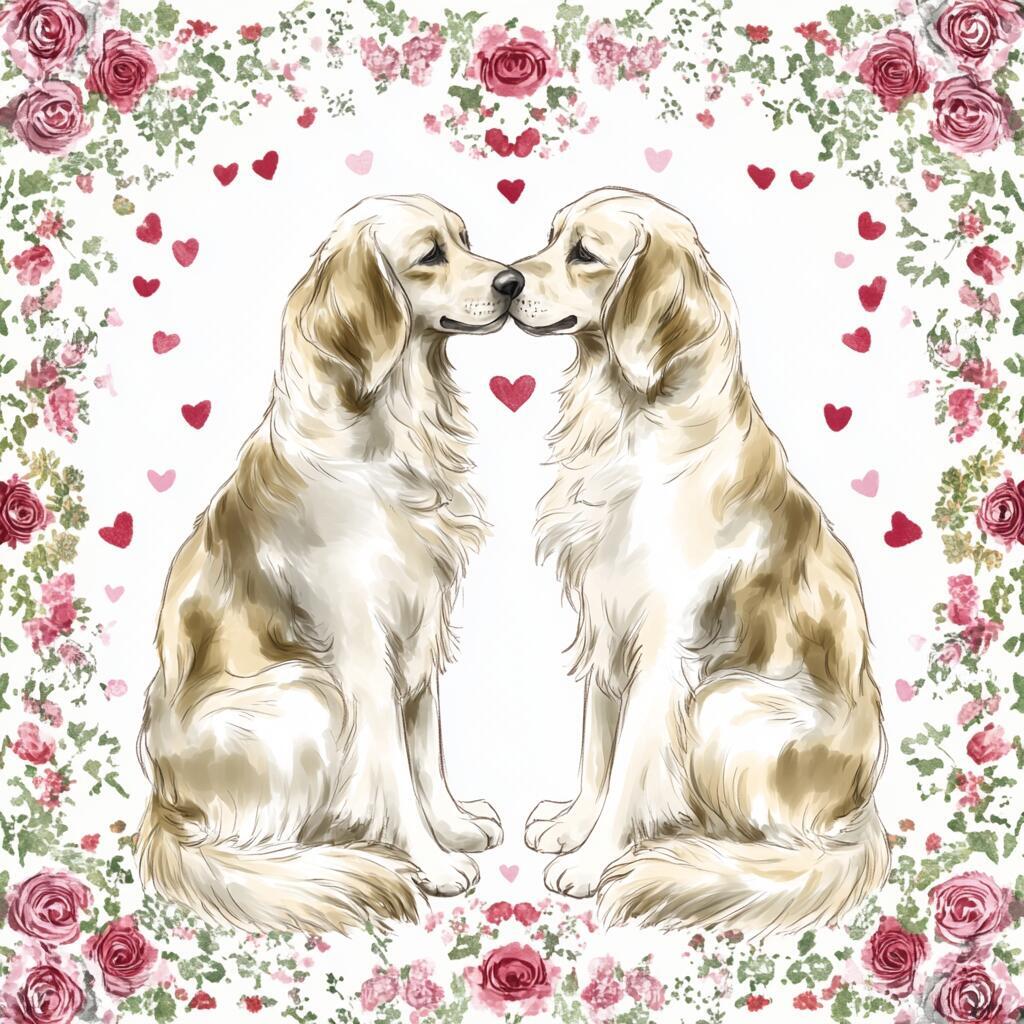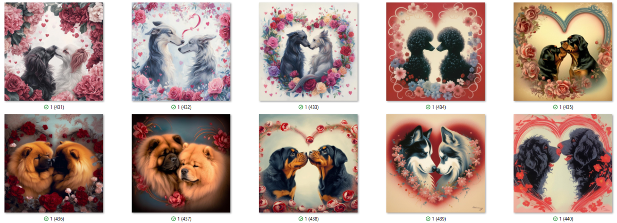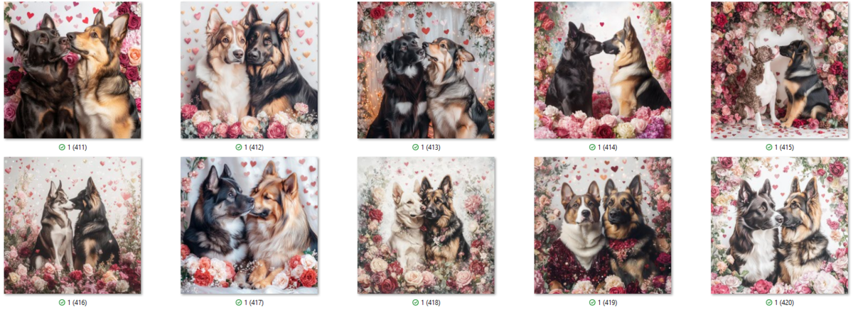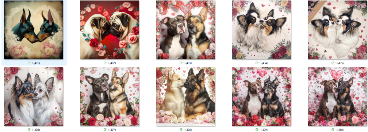 100 PNG image bundle of Valentine dogs featuring cute dog couples with roses, flowers and hearts.For commeercial use of physical products excluding transfers.