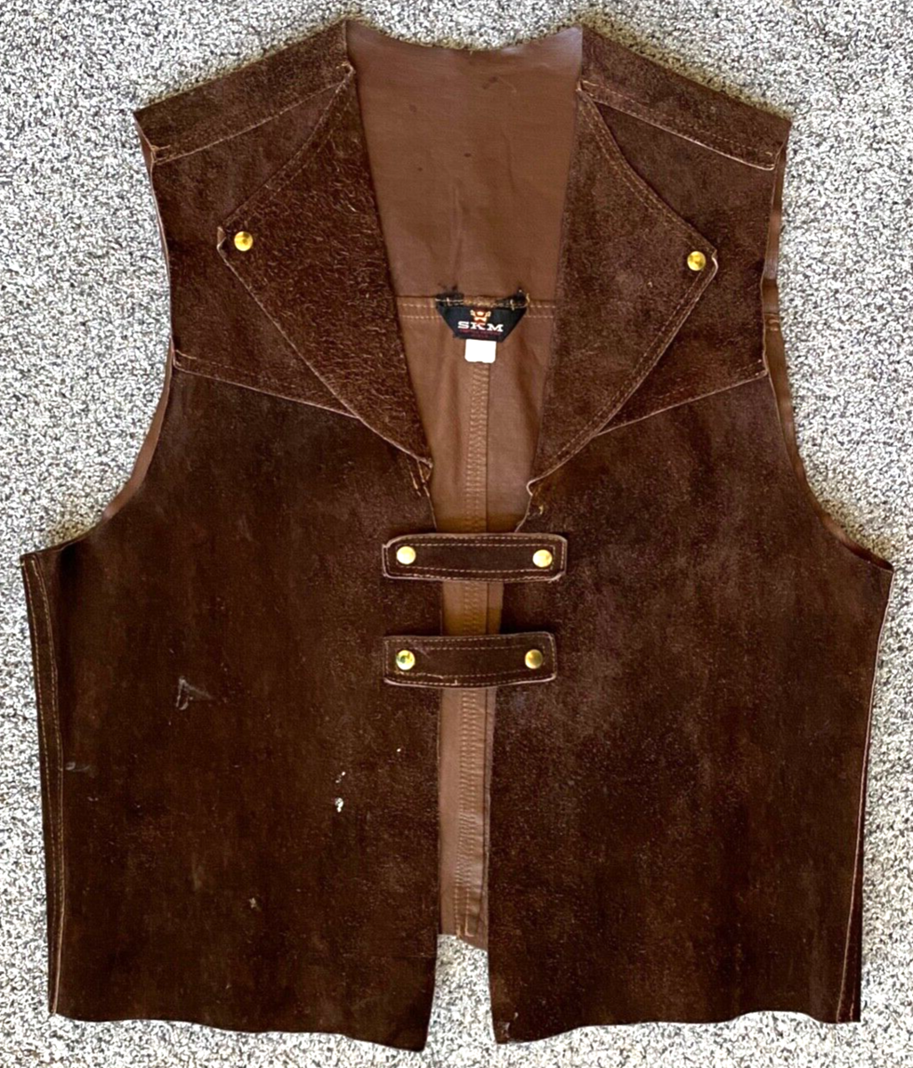 Vtg Leather Vest-SKM Seattle Knitting Mills-Brass Buttons-L-Western Cowboy Biker