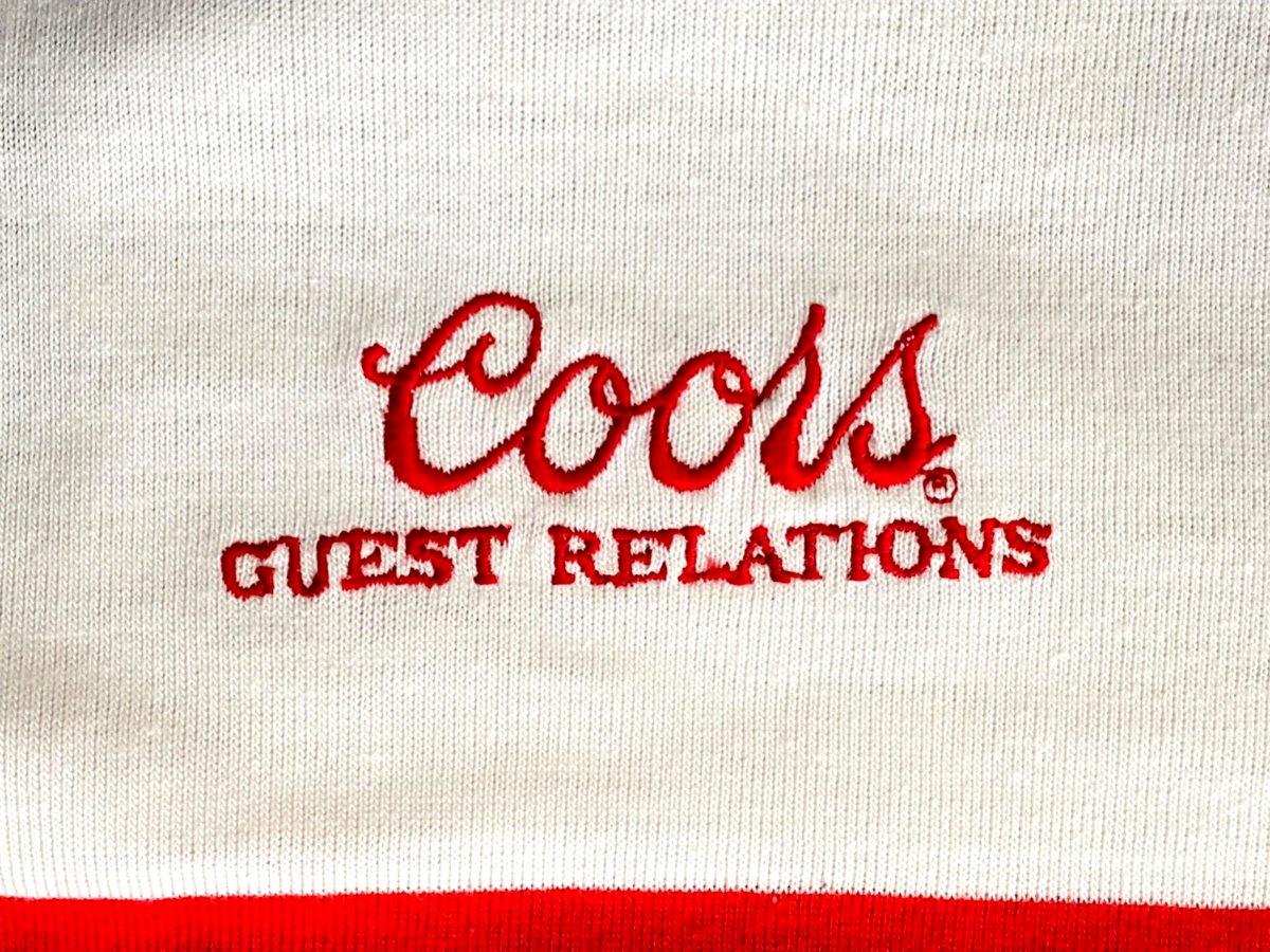 Vtg-COORS Guest Relations Employee Collar Shirt-White-L-Red Striped-Scott Eilers
