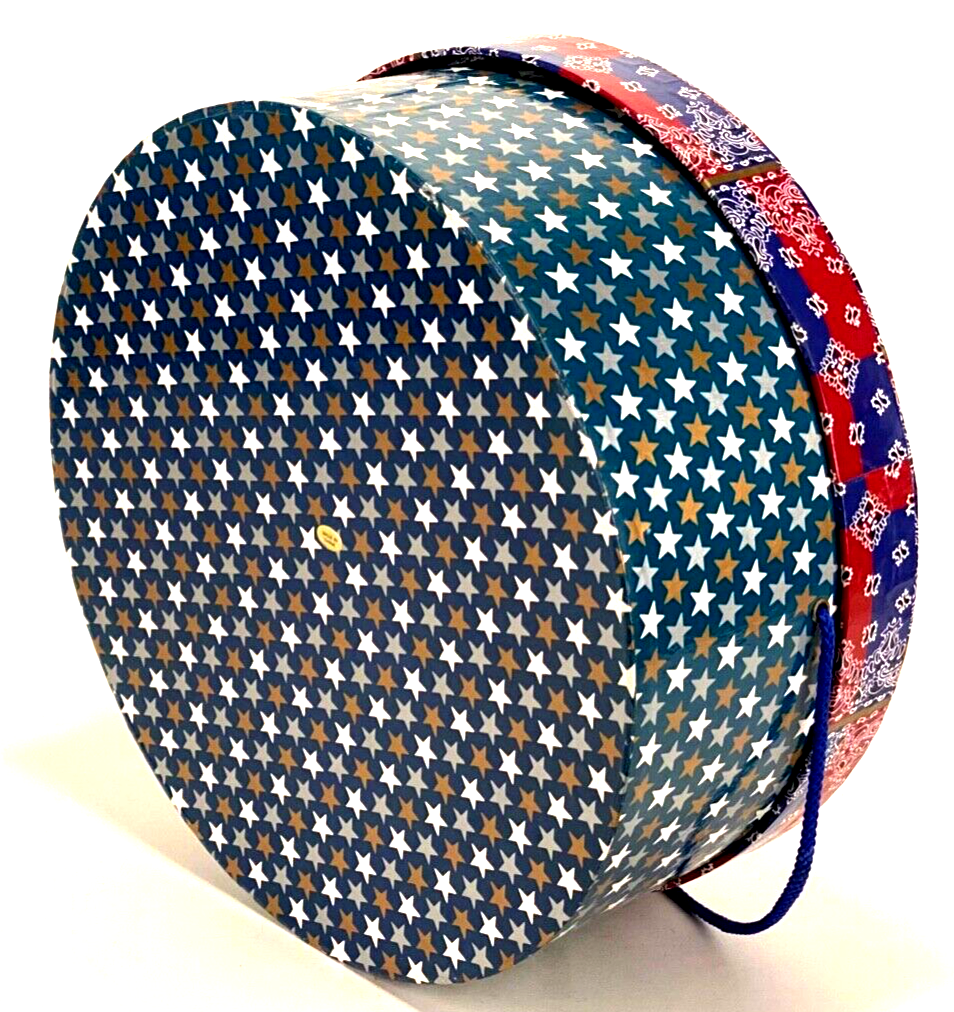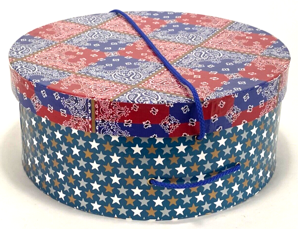 13" Round Sturdy Cardboard LADIES HAT BOX w Rope Strap - Stars & Bandanas